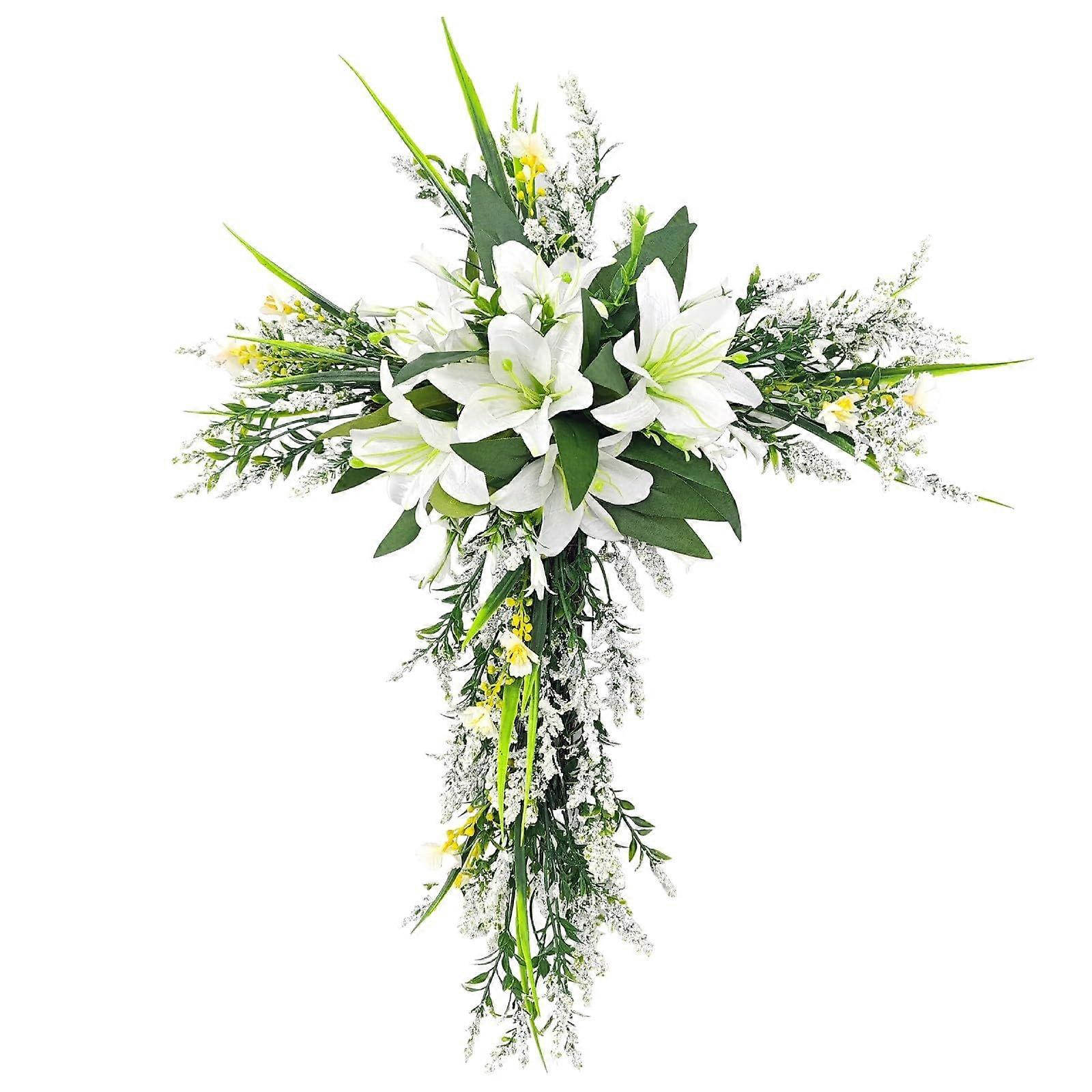 20 Inch Easter Cross Wreath Artificial Lily Purple Mesh Easter Wreaths for Front Door Spring Holiday Floral Wreath