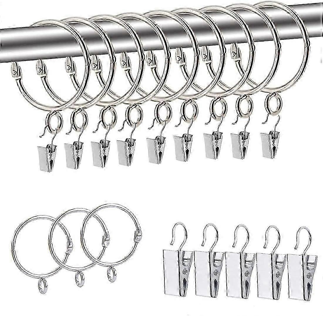 Package: Set of 20 openable curtain rings with clips; Material: Made of premium metal with durable plating for long-lasting rust resistance, each curtain ring can hold up to 6 pounds (3 kg); Easy Open & Close: They open easily, but are sturdy. which was perfect for a closed curtain rod. The clips hold well, have teeth so they don't slip off the weight; Size: The inner diameter of the curtain ring is 50mm(1.96") Application: The metal curtain clip rings are perfect for hotels, restaurants, cafes, bars, meeting rooms, bedrooms, bathrooms, etc., non-removable curtain rods.