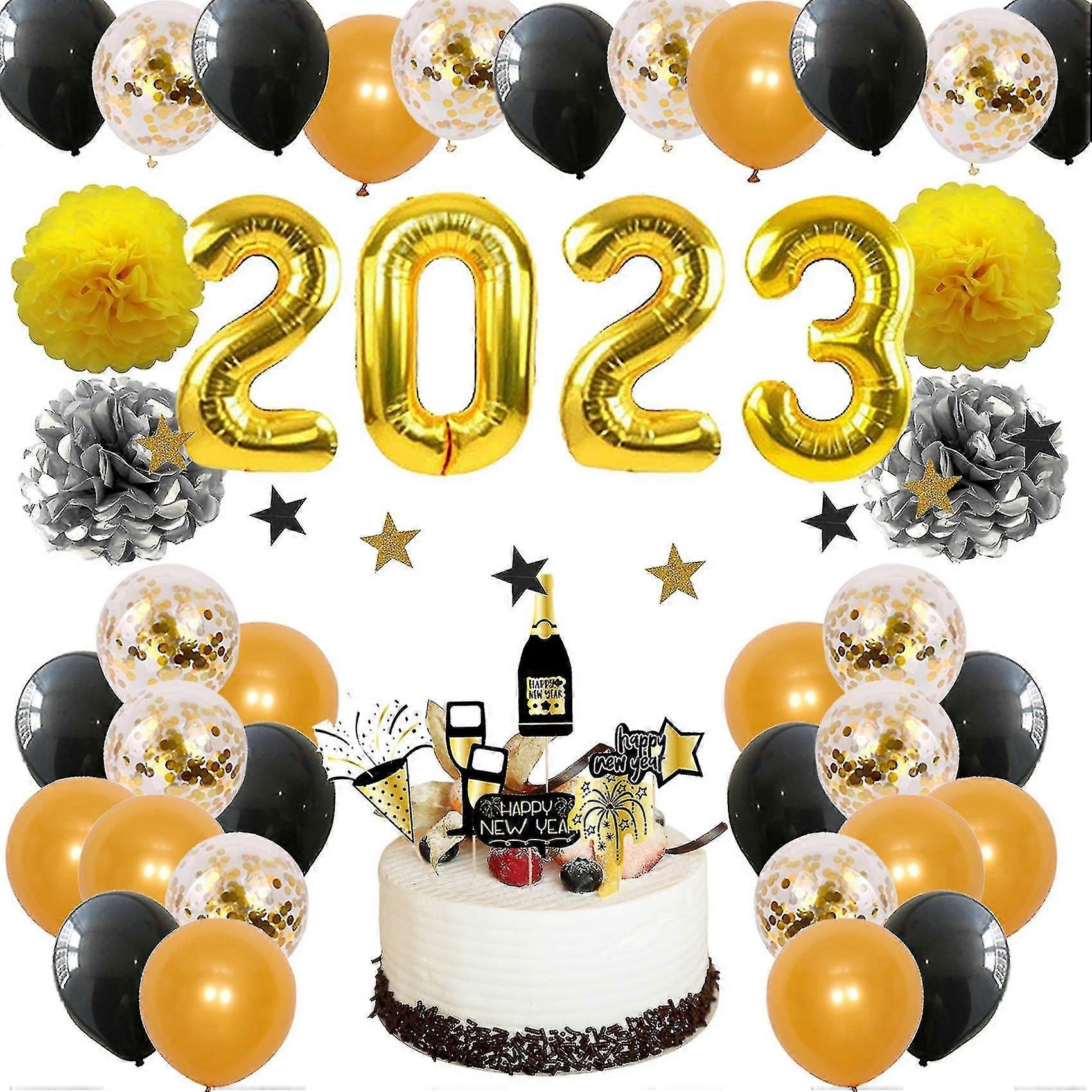 New Year 2023 Theme Balloon Party Set: 61pcs Digital Party Decorations with Pull Banner & Paper Flower Balls