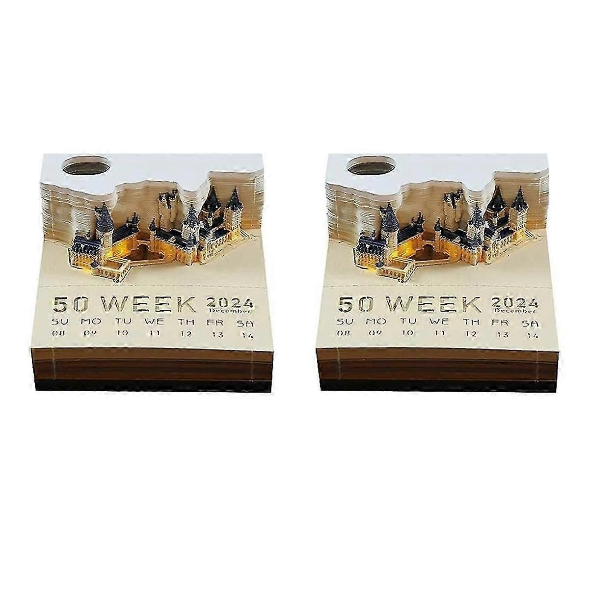 2024 Block Notepad with Calendar Square Castle LED 3D Notepad Sticky Notes Scrapbook Christmas Birthday Gift,2 Pcs
