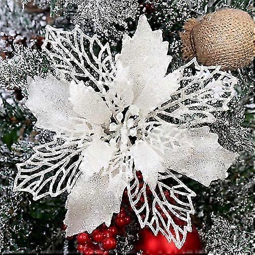 2024 12pcs 6.4inch Glitter Poinsettia Flowers Artificial White Christmas Flowers Christmas Tree Flowers Wreath Tree Decoration with 12pcs Green Flower
