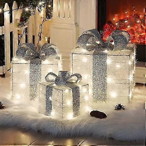 2024 3 LED Christmas decorations inside, gift light boxes with silver bow outside, Christmas box illuminated decoration with timer and 8 light modes f