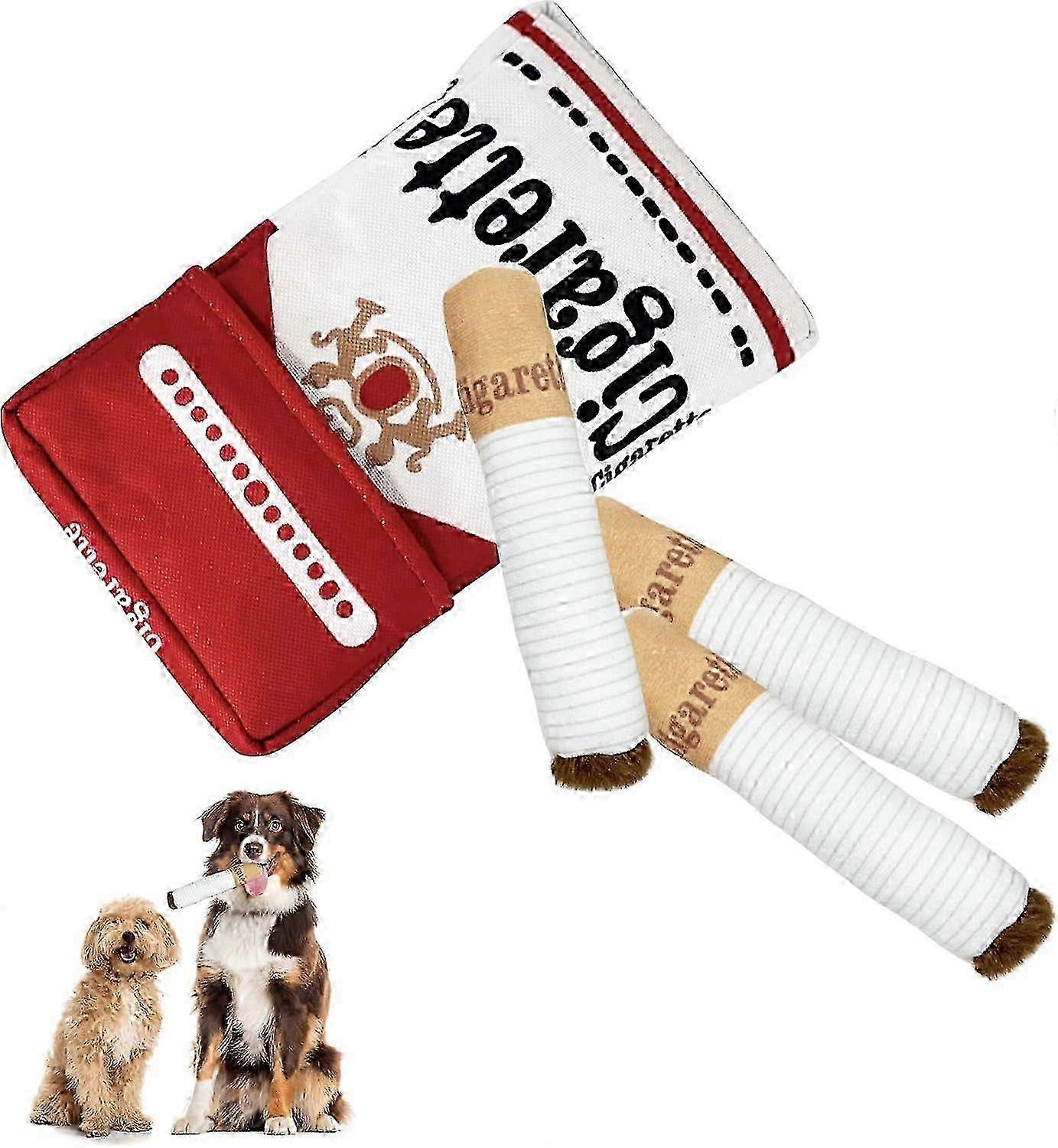 Features: Funny Cigarette Design: This playful pet toy mimics the shape of cigarettes, adding a unique twist to your pet's playtime. Each toy features a squeaker inside the cigarette shape, encouraging interactive fun as your cat or dog plays. The squeaky sound engages their curiosity, keeping them entertained for hours and helping them fall in love with their new toy. Value Set: This fun set includes 1pcs cigarette case toy and 3pcs squeaky cigarette toys that fit inside the case. These novelty toys are great for both pets and humansyour guests will laugh every time they see them Great for interactive play with dogs or as kicker toys for kittens, this set offers endless entertainment. Interactive Fun: Each toy in the set has a squeaker that activates when your cat or dog plays with it, making these toys irresistible. The squeaking sound excites pets, keeping them interested and engaged, which helps burn off excess energy. Toss the cigarette toy to encourage your pet to chase and bond with you during playtime. Hidden Training Fun: Make playtime even more rewarding by hiding treats inside the cigarette box toy. As your pet searches for snacks, they'll become more eager and energetic. This interactive activity can help reduce boredom, relieve stress, and burn off energy, making it suitable for high-energy pets. Great Gift Idea: Looking for a fun gift for pet lovers? This cigarette squeaky toy set is a great choice It's ideal for pet training, bonding, and relieving stress in both cats and dogs. The quirky design will bring laughter and fun to any pet-loving household. Package Included: 1 x Interactive Giggles Dog Toys Note: 1. Due to the different monitor and lighting effect, the actual color of the item may be slightly different from the color shown on the pictures. 2. Please allow 1-3cm error due to manual measurement. 1 inch 2.54 cm Thanks for your support : Note: Due to the light and screen setting difference, the item's color may be slightly different from the pictures. Please allow slight dimension difference due to different manual measurement. Sold by-YJL official store
