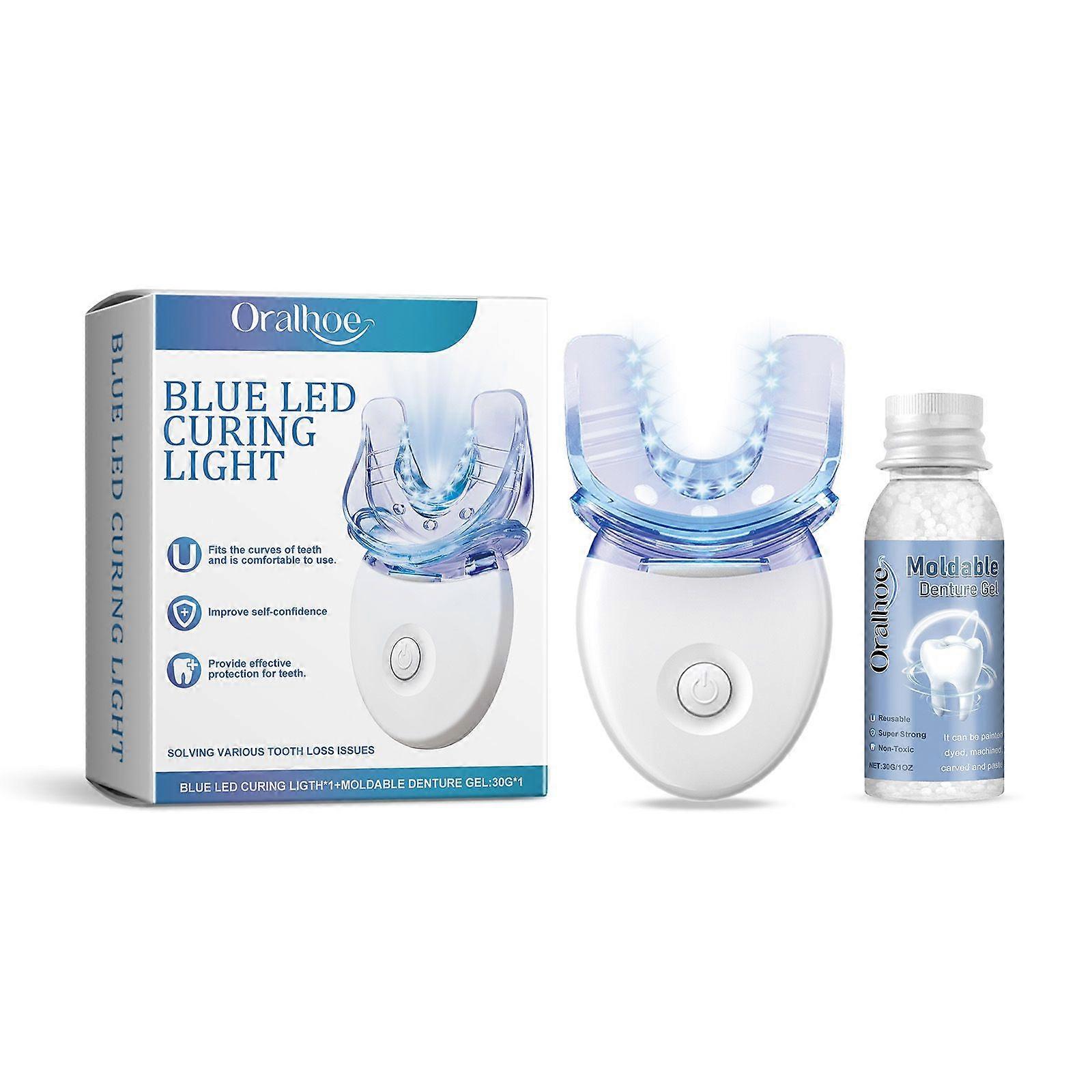 Our dental care kit contains dentures: silicone lamp: PP bottle: PET. It can quickly fill tooth defects and restore a confident smile with lifelike colors. Easy to operate easy to self-study and maintenance. Its use is simple: clean and dry the area where the repair material will be used. The plastic prosthesis mold is heated in water at 60 degrees. Shape it according to the shape of the teeth. Place the formed material between the teeth or in the missing tooth. Put the mouth holder of the blue LED curing lamp in your mouth stick it on your teeth turn on the switch and irradiate it for 3-5 minutes to cure the material. And can be safe material durable protect oral health. Improve your smile and show confidence.