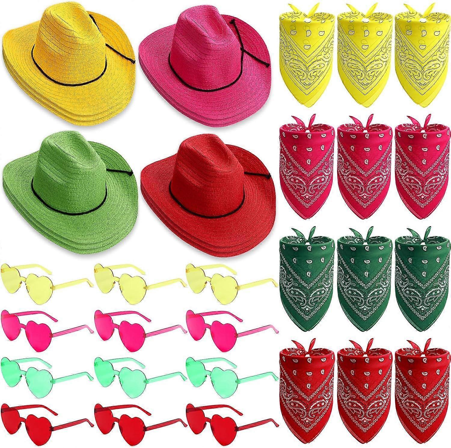 2025 Latest Model 12 Pieces Straw Cowboy Hats with Bandanas and Glasses, Costume