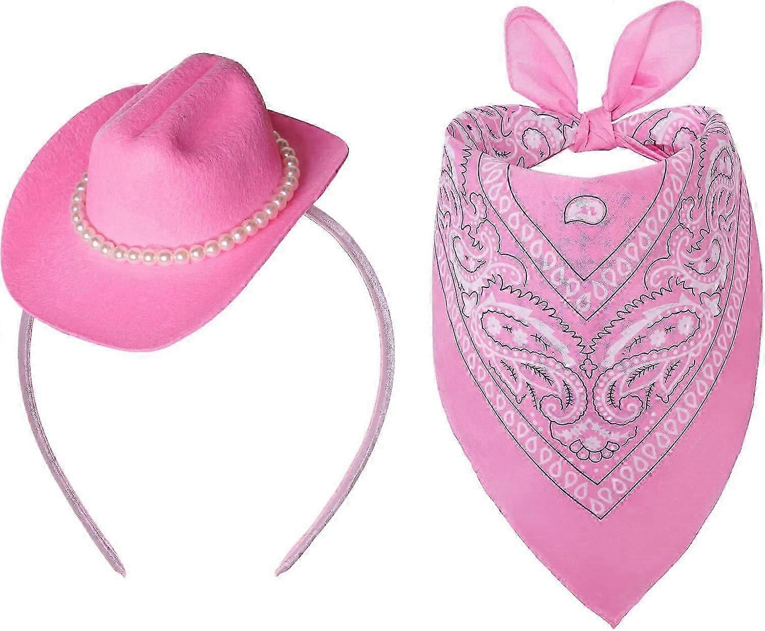 Enough Quantity to Wear: Each pack includes a pink cowgirl hat headband for women and a bandanna. Share with your friend or keep this novelty cowboy outfit accessories. These cowboy hat headbands are a fun and cost-effective way to complete your cowgirl costumeVersatile for Any Occasion: Our mini cowboy hat headbands with bandana are design in bright colour, making you stand out in the crowd. Pink cowgirl hat headband is detachable, elastic hair hoop fit for most women girls. Whether youre celebrating Halloween, a birthday party, or hosting a western cowboy-themed event, these mini pink cowgirl hat headbands are the great accessory to complement your outfitDetachable Design: These cowgirls' party hat headbands are detachable, and convenient to carry, comfortable for most head types. Just insert these mini cowboy hats headbands into the elastic band under the hat before use, making them an nice choice for parties, activities or daily wearAdorable Cowgirl Style: Elevate your western-themed party or costume with these charming mini pink cowgirl hat headband and bandanas. Designed to add a touch of country flair to any outfit, these mini cowboy hats headbands are the wonderful accessory for women to dress up