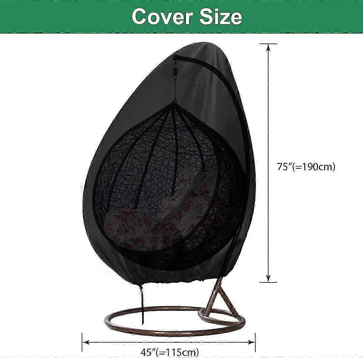 Water-resistant and Durable Material: Hanging chair cover is made of 210D waterproof Oxford fabric and uses double-stitched seams. The fabric is very flexible and durable enough, will give your hanging chair much protection, such as wind, rain, snow and others. Not only does it offer better water resistance and crack resistance, but it is also environmentally friendly Tear Resistant & UV Protection: The hanging chair covers have EXTERIOR bound seams and high-density stitching for optimal water resistance and durability. The UV stabilized coating will protect your hanging chair from the sun's rays Fits Most Hanging Chairs: L: 190 cm x Dia: 115 cm. This hanging chair cover fits different styles and brands of patio hanging chairs, good for protecting from outdoor elements like stronger winds, rain, sun, snow, leaves, dust and more, extending the life of your outdoor furniture. TIPS: Tie a knot after tightening the drawstring. Adjustable Hem Cord: Adjustable belted hem allows adjustment for a tight custom fit, provides your patio chair cover with a customizable fit Exceptional security in the windiest conditions. Size: 190*115cm,Black color Delivery quantity: 1 piece