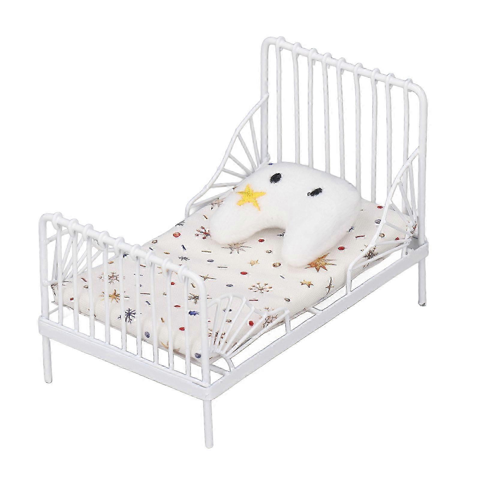2025 1:12 Scale Dollhouse Furniture Mini Bed Set Decorative Pillow Metal Frame Realistic Miniature Bed White Star Pattern