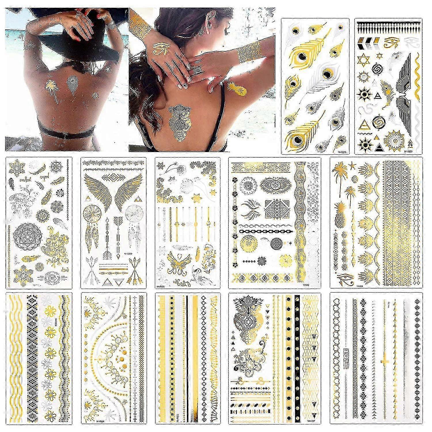 2025 12 Sheets Metallic Temporary Tattoos, 150+ Shimmer Designs Black Silver Gold Temporary Tattoo Jewellery Tattoos Flash