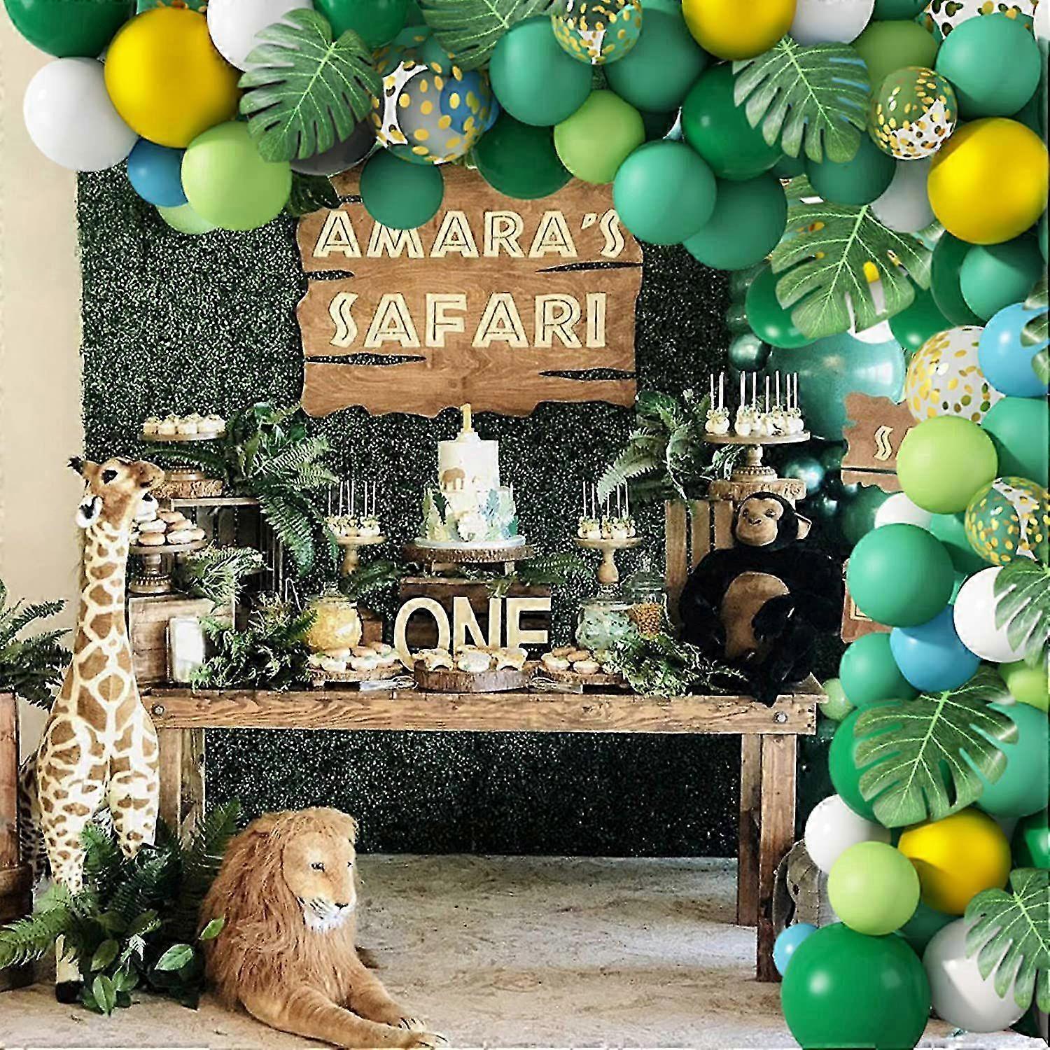 Package Includes - 133pcs jungle theme party balloons, 10pcs artificial palm leaves & 3pcs balloon tools: 12"gold confetti balloons(5Pcs), 12"black/dark green latex balloons(10Pcs), 10''metallic gold/dark green/white/light green balloons(35Pcs), 5''dark green/fruit green/lake blue/white latex balloons(80Pcs), 3pcs big animal foil balloons, 10pcs artificial tropical palm leaves & 3pcs balloon tools, meet all your jungle theme party supplies ideas.Premium Quality - The green balloons made with natural latex, non-toxic, and every balloons have been rigorously tested and selected manually, safe to be used for children. These safari balloons can be filled with air, helium or water. The balloon tool can make the balloons and palm leaves easy to stick together and form a jungle theme balloon arch kit, and the different sizes and color help the balloon garland kit looks fuller and more organic!Suitable for Many Occasions - The balloon decorating strip can make various types of green jungle balloon arch kit, bring you a gorgeous jungle theme party decorations. Suitable for wide scenes, kids birthday party, safari birthday party decorations, green theme party, jungle theme baby shower, bridal shower, wedding etc. Perfect party decorations for adding funny and happy atmosphere.Make Your Jungle Theme Party Unforgettable - Our package also comes with 4 balloon accessories, including balloon arch strip, balloon glue ponits, tying tool and ribbon. These tools can help you build a beautiful green jungle balloon arch to enrich your party decoration and create a memorable memory for you and your friends.Warning - Choking hazard! Children under 8 years old can choke or suffocate on uninflated or broken balloons! Parents supervision required! Keep uninflated balloons from children! Discard broken balloons at once. Note: Due to the light and screen setting difference, the item's color may be slightly different from the pictures. Please allow slight dimension difference due to different manual measurement. Sold by-YJL official store