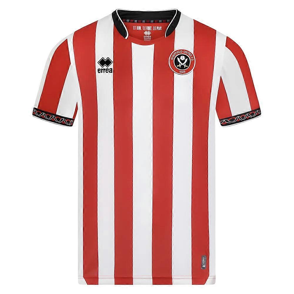 Step out in style with the official Sheffield United home shirt for the 2025-26 season, crafted by Errea. This stunning replica jersey captures the essence of Bramall Lane with the iconic red and white stripes that have defined the Blades for generations.Key Features:Classic red and white striped design honouring Sheffield United\'s rich heritageHigh-performance Errea fabric technology for superior comfort and breathabilityMoisture-wicking properties keep you cool during match day excitementTailored athletic fit suitable for supporters and active wearOfficial club crest and Errea brandingPersonalisation Options: Make this shirt truly yours with our personalisation service. Add your favourite player\'s name and number, or create a unique shirt with your own name on the back.Perfect For:Match day support at Bramall LaneCasual wear showing your Blades prideGift for the Sheffield United fan in your lifeCollectors of official football memorabiliaPersonalisationName & Number - Customise your jersey with the name and number of your favourite Sheffield Utd player or even your own name. We can print name in the same style worn by the players.