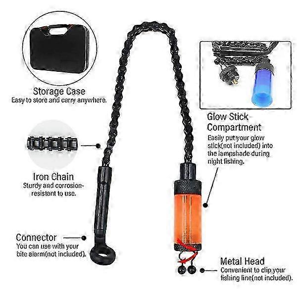 Features: * 21cm (8.3") iron chain for durability and high strength. * Easily accommodates a glow stick (not included) in the head for night fishing. * Metal head enhances line tension, improving hookset sensitivity. * Includes four chain alert swingers and a storage case. * Storage case for convenient storage and carrying. * Suitable for both day and night fishing. Specification: * Lampshade Color: Red / Blue / Green / Orange (optional) * Chain Length: approx. 21cm / 8.3in * Total Length: 35cm / 13.8in * Unit Weight: approx. 108.6g / 3.8oz * Storage Case: 21 x 5 x 16cm / 8.3 x 6.3 x 2.0in * Total Weight: approx. 660g / 23.3oz Package List: * 4 x Fishing Swingers * 1 x Storage Case Note: Due to the light and screen setting difference, the item's color may be slightly different from the pictures. Please allow slight dimension difference due to different manual measurement. Sold by-YJL official store
