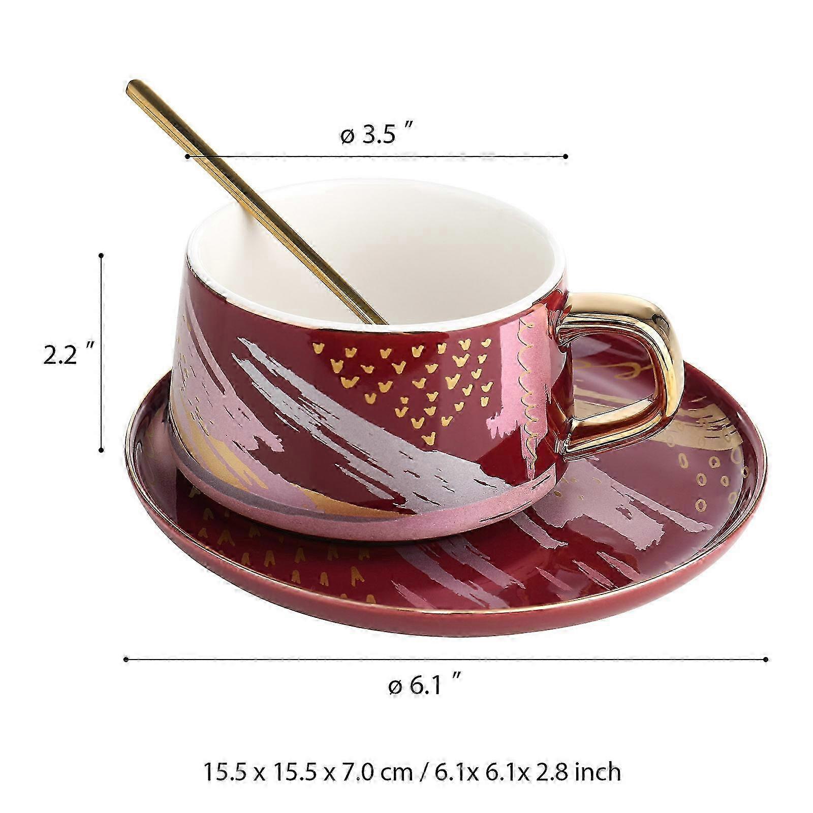 A set contains a cup, a saucer, and a 304 stainless steel spoon, in 4 different colors. The classic coffee cup shape and the personalized brush color created a visual effect of classic and collision. Made of high-grade ceramics, it is secure and durable, and can definitely meet your needs in the office and home - coffee, tea, juice, cocoa, etc. The coffee cup uses Heraeus golden water to depict the handle of the cup, and hand-applied with painting patterns, and then fired in a high-temperature kiln at 780℃. The glaze is smooth and translucent, and the color is rich and brilliant. Stainless steel spoons use an edible plating process, so both spoons and cups are not suitable for microwave use but available in the dishwasher. This coffee cup is suitable for all kinds of occasions, as a perfect home decoration for tea or coffee parties, birthdays, Christmas, offices, etc. Enough for you and your family and friends to enjoy a pleasant tea time. The packaging of the exquisite gift box is more gorgeous and high-end, making the coffee cup a gift and regard to sharing with friends and family.