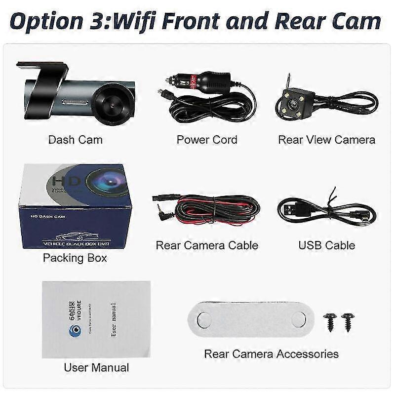 WIFI Dual Car Dash Camera Dash Cam for Car Driving Recorder Auto DVR Dashboard Camera Front and Rear View Vehicle Digital Video<br> <br> WIFI Dual Car Dash Camera Front and Rear View<br> <br> Features :<br> <br> ãWIFI & APP controlãThe Wifi product has built-in WiFi, and 0 traffic helps you connect with the mobile phone. It is displayed on the mobile phone without a fixed screen and can be placed freely. You only need to move your mobile phone to the desired location. Moreover, the connection of the mobile app will make it easier to save the video. When you record a beautiful journey scenery, you can share it with your family and friends at any time. In addition, as far as the video recorder itself is concerned, operations such as system function upgrades can also be completed more conveniently.<br> <br> ãBuilt-in recording and  G-sensorãThe built-in microphone will record the surrounding sounds in real time, including speaking, whistle, singing, etc., and record the sound details during your driving. On the one hand, when an accident happens, sound recording will provide you with more convincing evidence. On the other hand, combined with the built-in camera and sound recording, you can record the happy time with your relatives, friends and lovers on the journey.<br> <br> ãAautomatic loop recordingãThe loop recording function is to ensure that there is always enough storage space for new videos in the memory card. It will automatically cover the video with the farthest time distance to ensure sufficient storage space.<br> <br> ãHigh night vision difinitionãThe high-definition recording effect and night recording function ensure that the picture recorded at night is bright and clearly visible. It can ensure your mastery and attention to the details of the surrounding pictures during the driving process. Especially when something unexpected happens, it can give you more persuasive details of the evidence.<br> <br> ãWide angle and rotated lenã140-degree wide-angle shooting and rotated len, suitable for most vehicles except large trucks, provides enough picture details within the angle range without serious picture distortion, making you more comfortable visually. At the same time, the main function of wide-angle shooting is retained, which can ensure the safety of the car during driving in a wider range and more directions. And when an accident occurs, it can provide more picture details, such a design will be your important witness.<br> <br> ãSmall valume and easy installationãIt can ompatible with usb/rec car interface connection, easy to install and non-destructive installation, without any impact on your car, applicable to 99% vehicles with rec or USB interface near the rearview mirror.