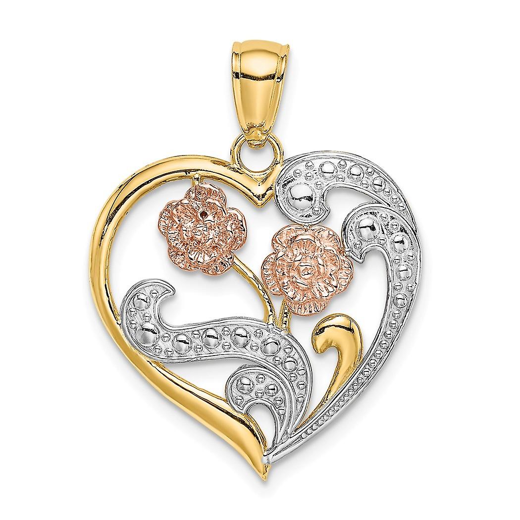 20mm 14k Two tone Gold Love Heart Pendant Necklace With Cut out Flowers and Swirls Tri color-Pendant for Women