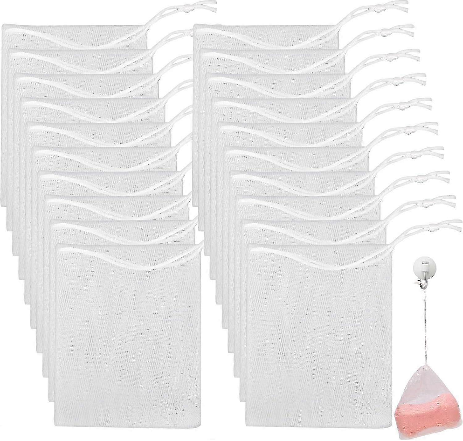 The package includes: 20Pcs mesh soap bag. The design features a convenient drawstring closure made of white ribbon for extra security. Hang and store your favorite soap without creating a mess in your bathroom. Size: Approx. 12 * 9/ 4.7 * 3.5inch. Enjoy the comfort and durability of our top-class materials. Reduce Soap Waste and Extend Its Lifespan: Stop wasting soap slivers by collecting them in our mesh foaming net soap sack bags. These bags make it easy to use even the smallest soap pieces, ensuring that nothing goes to waste. Their double-sided four-layer thickened design ensures effectiveness and durability. Instant Foaming Action for Shampoo Bars: Use our foam net exfoliating mesh soap bag specifically designed for shampoo soap bars. Simply wet the bag and watch it quickly foam up when you rub it on your hair. It provides a convenient and mess-free alternative to applying the bar directly onto your head. Convenient and Travel-Friendly: Make your travels and camping trips hassle-free with our foaming net. No more dealing with wet soap or carrying bulky containers. After use, simply rinse the soap and bag with clean water and hang them up to dry. Take cleanliness on the go! Perfect Gift for Any Occasion: Show your loved ones how much you care by gifting them handmade soaps along with our small mesh bags. Our exfoliating mesh soap saver pouch bags are suitable for various cleansing products, including handmade soap, facial soap, cosmetic soap, fruit soap, and oil soap. The elastic material ensures a secure fit. Experience the benefits of creating abundant lather and exfoliating your skin with ease.