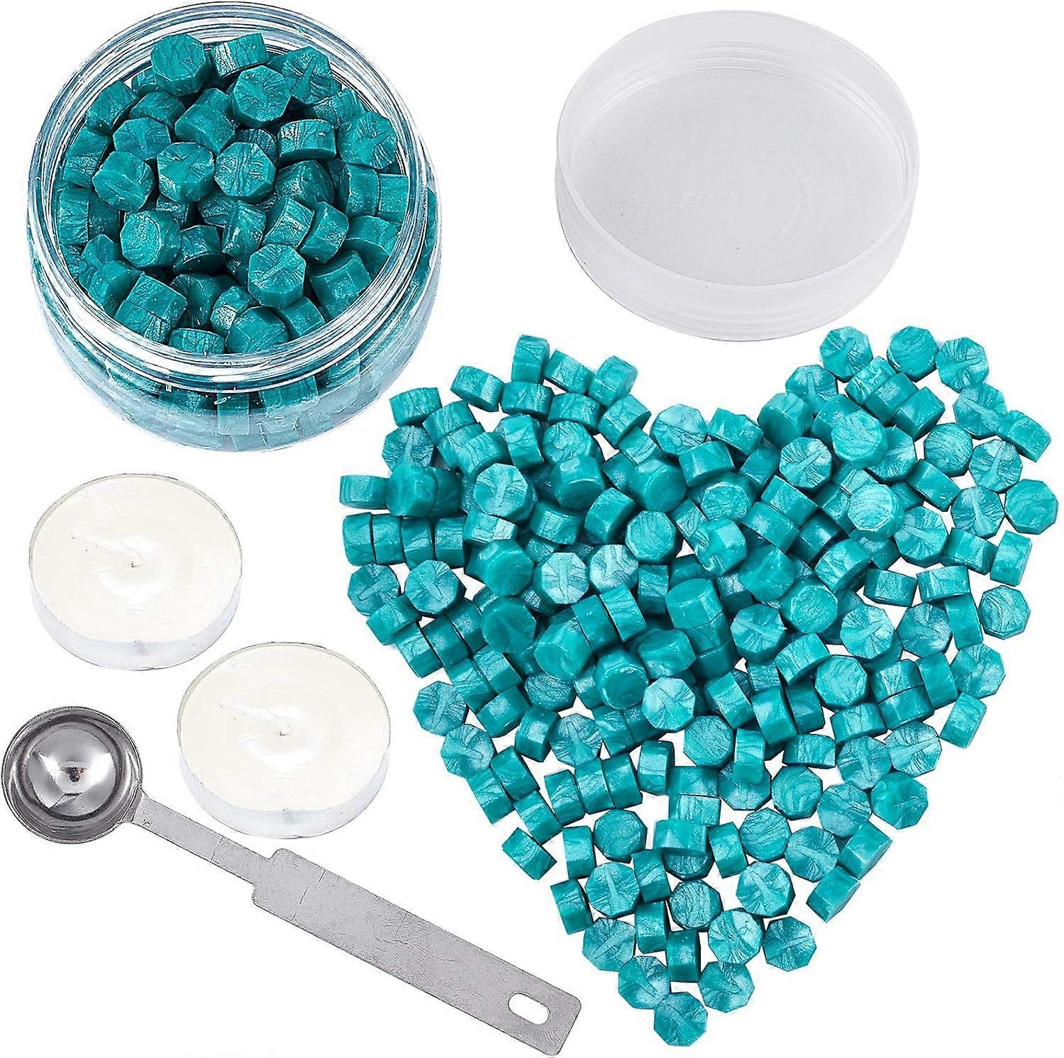 210PCS Wax Seal Beads Green Octagon Sealing Wax Beads Kit Packed in Can 9mm Wax Seal with 2Pcs White Tea Candles 1 PC Metal Wax Melting Spoon for Lett
