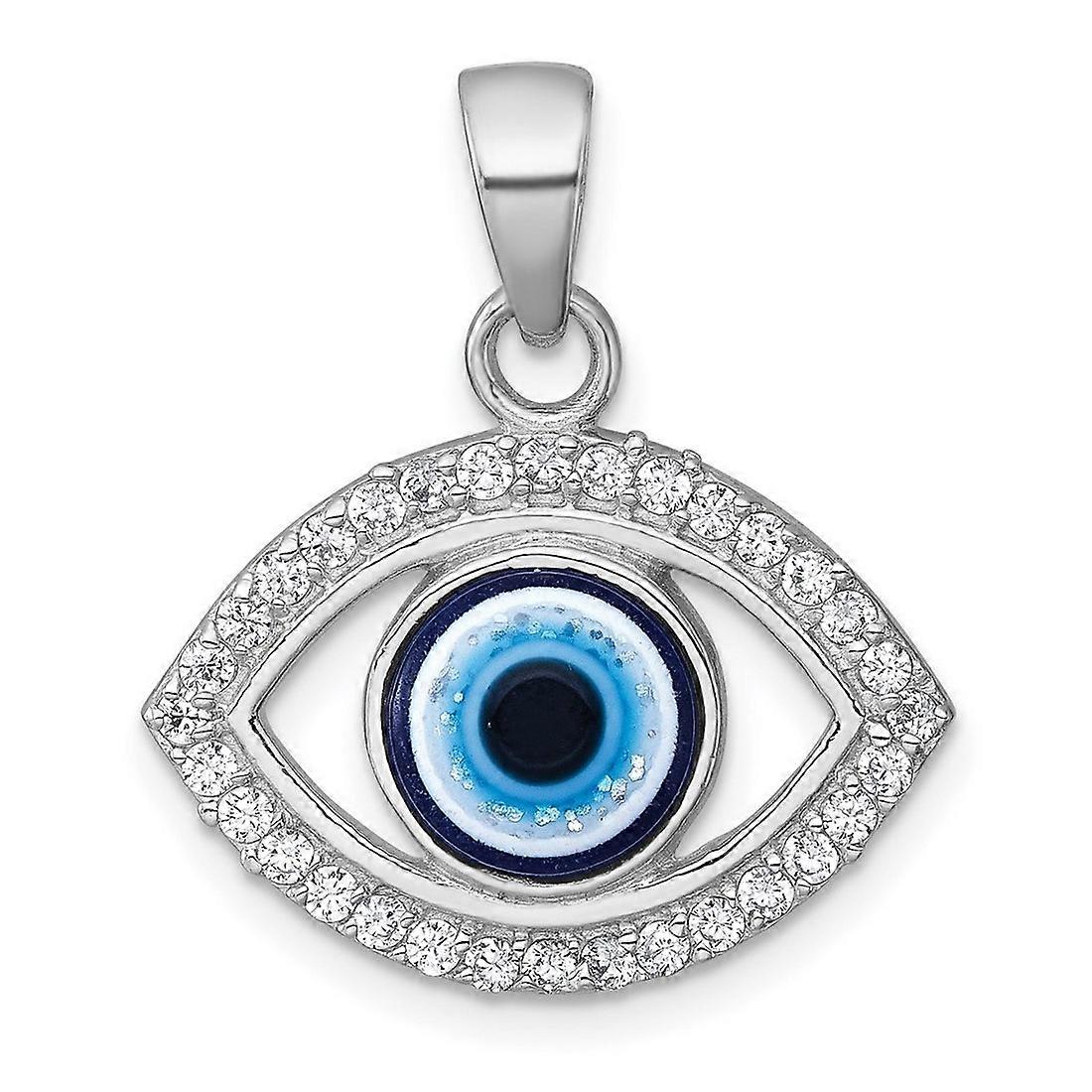 22.1mm Sterling Silver Rhodium-plated Polished Cubic Zirconia and Glass Evil Eye Pendant - 2.8 Grams In Sterling Silver in Plated Metal - - Charm/Element Width: 22.1 mm - Charm/Element Thickness: 4.75 mm - Width of Item: 22.1 mm - Charm/Element Length: 19.4 mm - Length of Item: 23.4 mm - Bail Length: 8.2 mm - Bail Width: 3.7 mm - Finish: Polished - - This Item Does Not Ship With a Chain - [ Potential Enhancement Methods: cubic zirconia ] - Synthetic. Some are covered with a product that makes the stone more durable. - [ Care and Handling: cubic zirconia ] - Clean with warm soapy water and a soft cloth. -