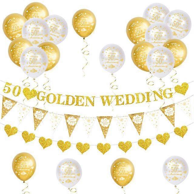 Package Including - 20pcs golden latex balloons, 1pcs 50th anniversary triangle bunting, 1pcs golden 50th anniversary banner, 1pcs golden heart-shaped bunting, 23pcs in total, a great combination for golden wedding anniversary decorationsSpecial Design - 50th anniversary banner is beautifully designed, the latex balloons with printed happy 50th golden anniversary, each flag of the pennant banner is designed with golden anniversary and 50th on one side, the other side is printed with romantic hearts and stars, making the party decorations more impressive and attractiveProduct Material - Our golden 50th wedding anniversary set balloons are made of natural latex, 50th anniversary pennants and soft satin, comfortable and reusable, making it perfect for 50th wedding anniversary decorationsSweet Backdrop - This anniversary set can be stuck on the wall dessert table, garden, front yard or balcony, we have related accessories to make it easier for you to install them, classical and unique for your party50th Anniversary Themed Party Decoration - On your special 50th anniversary day, you need a balloon set like this to decorate your home, it can be used to decorate your house or outdoor space, make your parents or your couple have a sweet and wonderful party