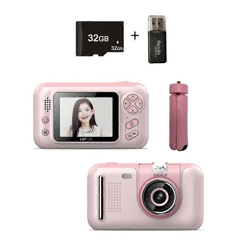 2.4 Inch Children HD Reversible Photo SLR Camera, Color: Pink + 32G Memory Card + Card Reader