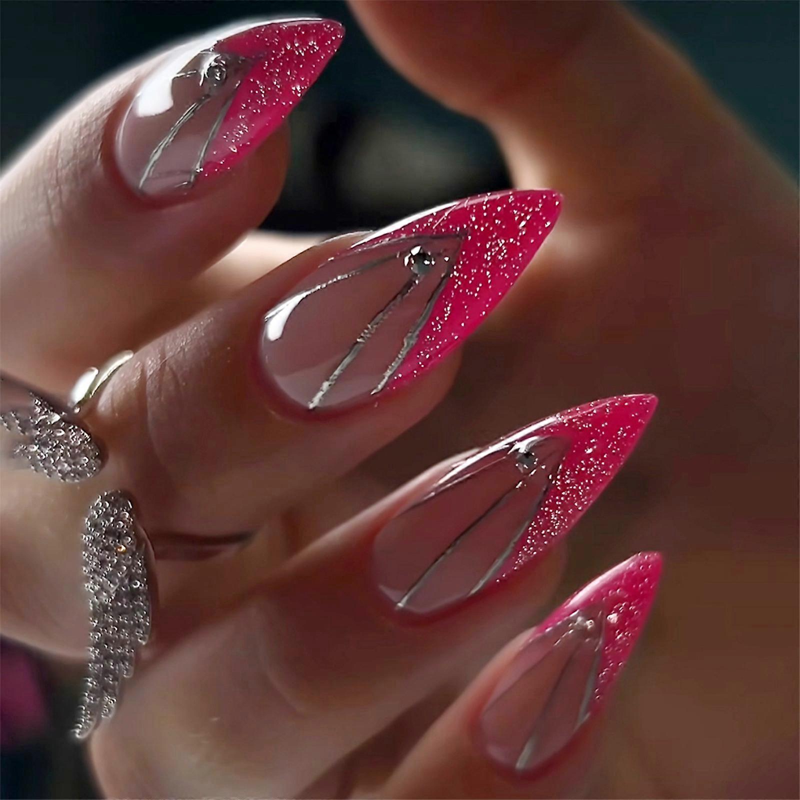 24 Pieces Short Almond French Glittering Acrylic Press On Nail Full Cover for Women and Teens Quick Manicure Nail Art