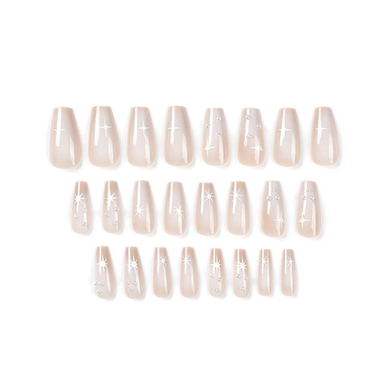 24 Pieces French Tip Nail Long Press-On Nail Artificial Pearl Decorations Include Nail-Glue for Women Girl DIY Nail Art