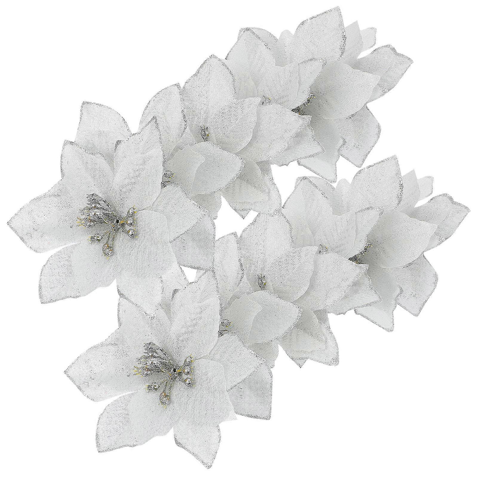 24pcs Glitter Artificial Christmas Flowers Silver Xmas Faux Poinsettia Decorations for Tree Table Centerpiece DIY Holiday Party Festive Scene Accents