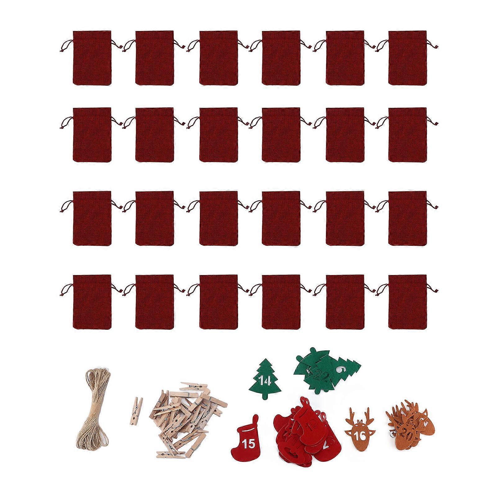 24Pcs Christmas Advent Calendar Drawstring Bags Reusable Hanging Countdown Pouch for Candy Jewelry GiftWine Red