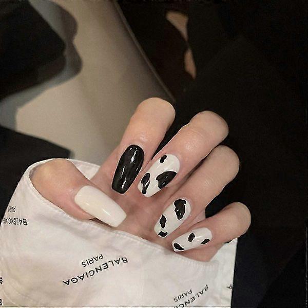 24pcs Medium Coffin False Nails, Fashion Ballerina False Nails, Black White Cow Press on Nails, Glossy Acrylic Nails for Women and Girls. Note: No