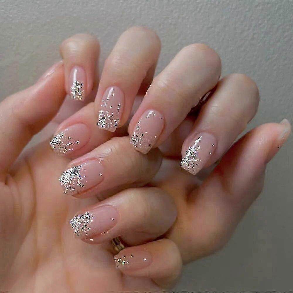24pcs Short Round False Nails in French Blue with Sparkling Pearl and Wavy Love Heart Design for Full Cover Detachable Press On Nail Tips