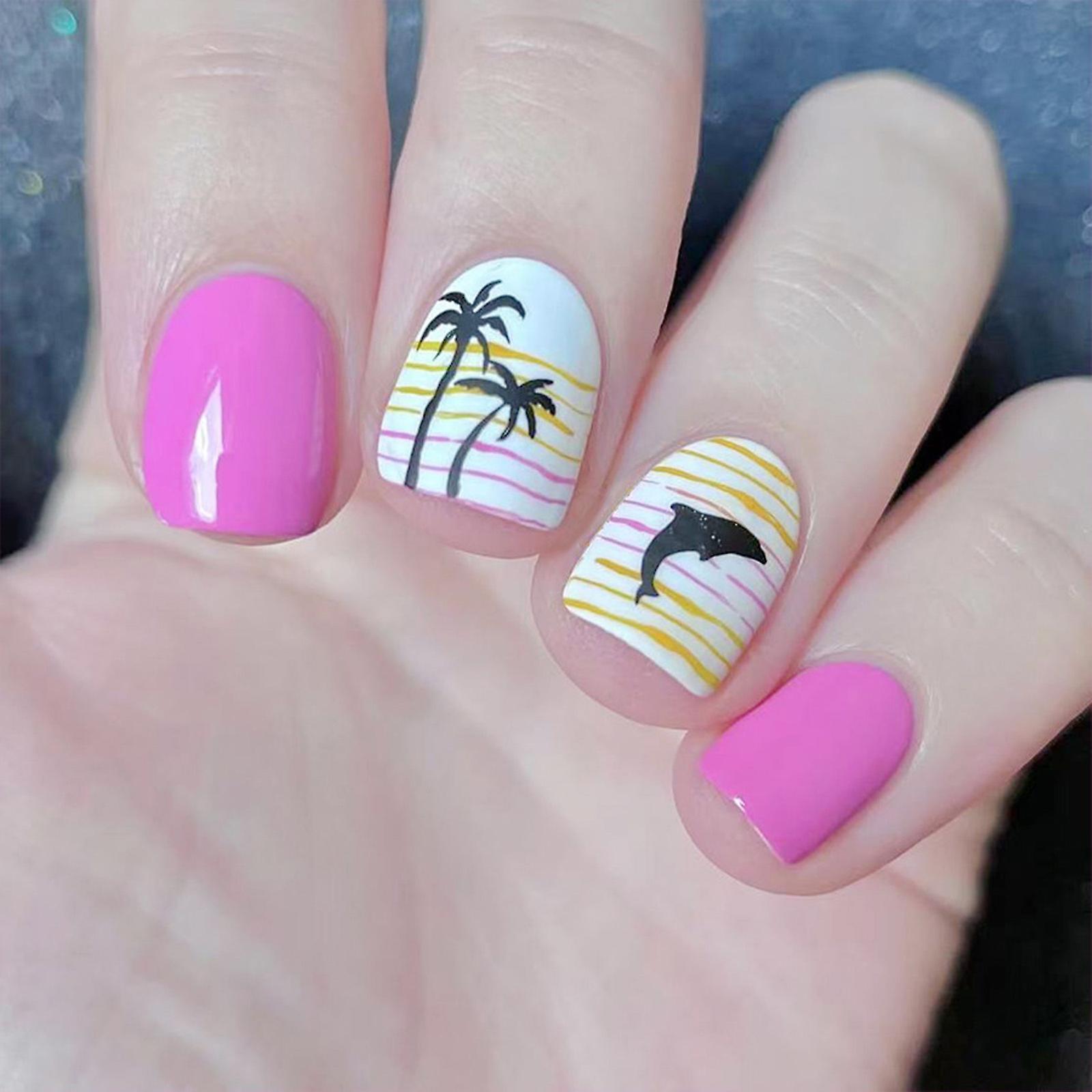 24 Pcs Short Square Stick on Nail Glossy Full Cover False Nail Dolphin Press On Nail Manicures Supplies for Woman