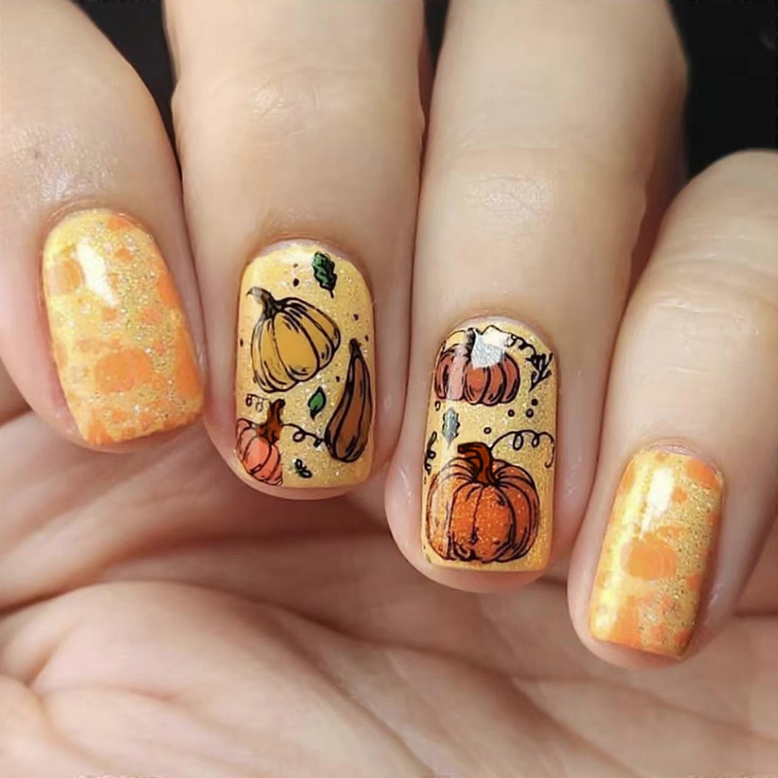 24 Pcs Short Square Press On Nails Thanksgiving Nails Pumpkins False Nails Fall Full Cover Stick on Nails for Women