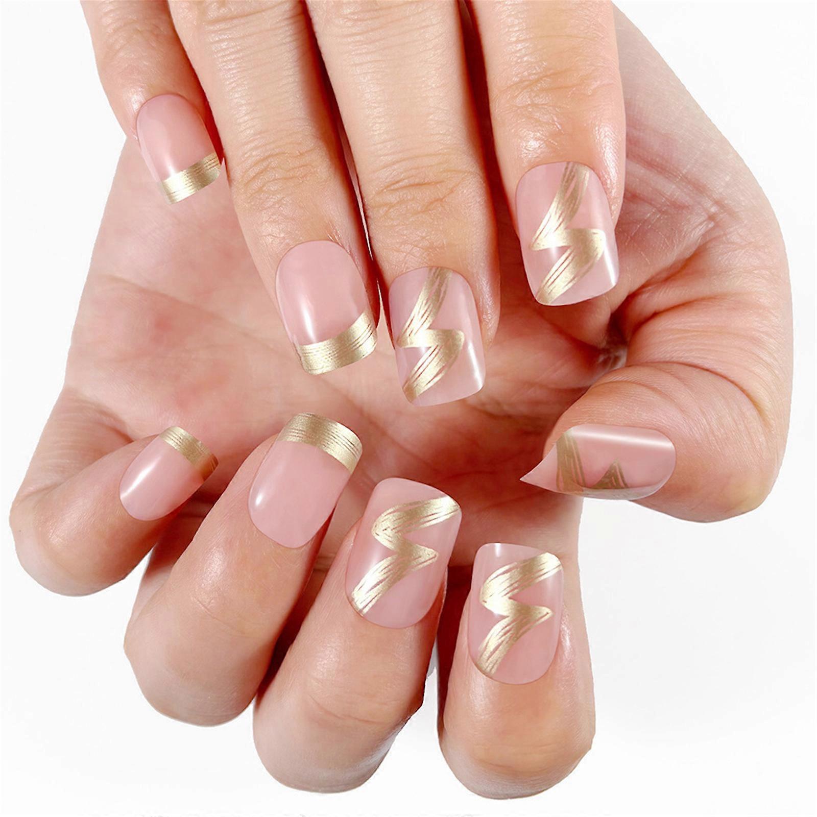 24Pcs Short Square Press on Nail Full Cover False Nail Glossy Gold French Tips Stick On Nail for Women and Girls