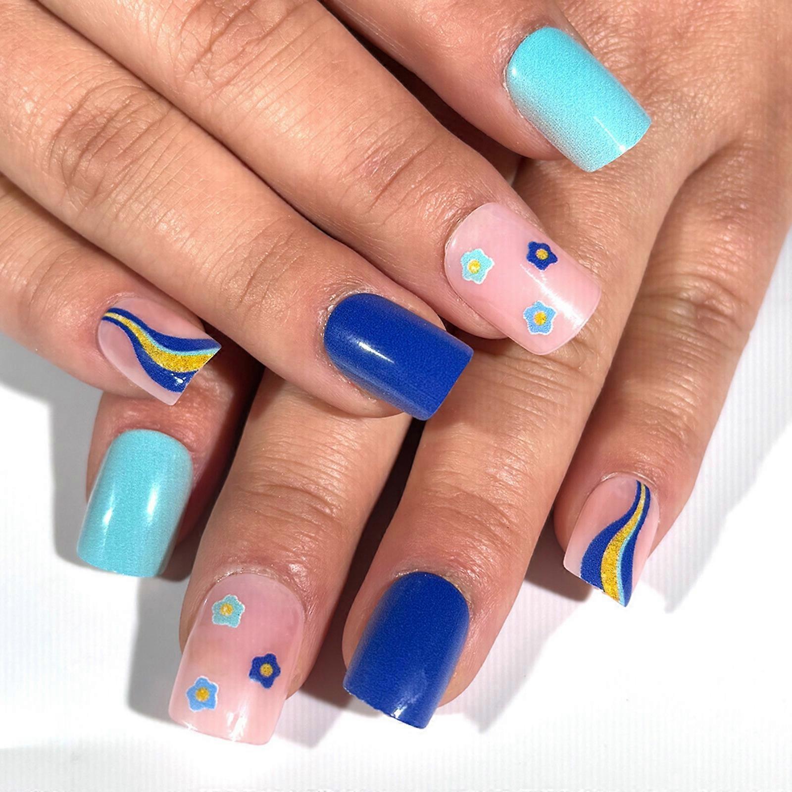24 Pcs Flowers Stick on Nail Blue Artificial Nail Short False Nail Swirls Press On Nail for Woman and Girls