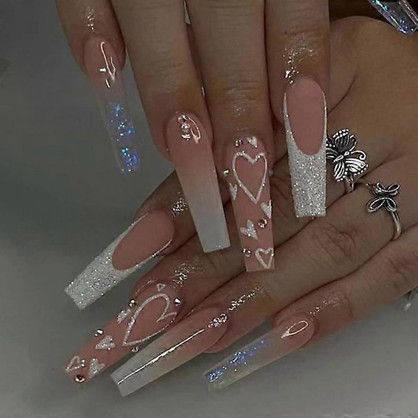24pcs Long Coffin Shaped Ballerina False Nails Pink False Nails Heart Design Full Cover Shimmering Glittering Press on Nails with Glue