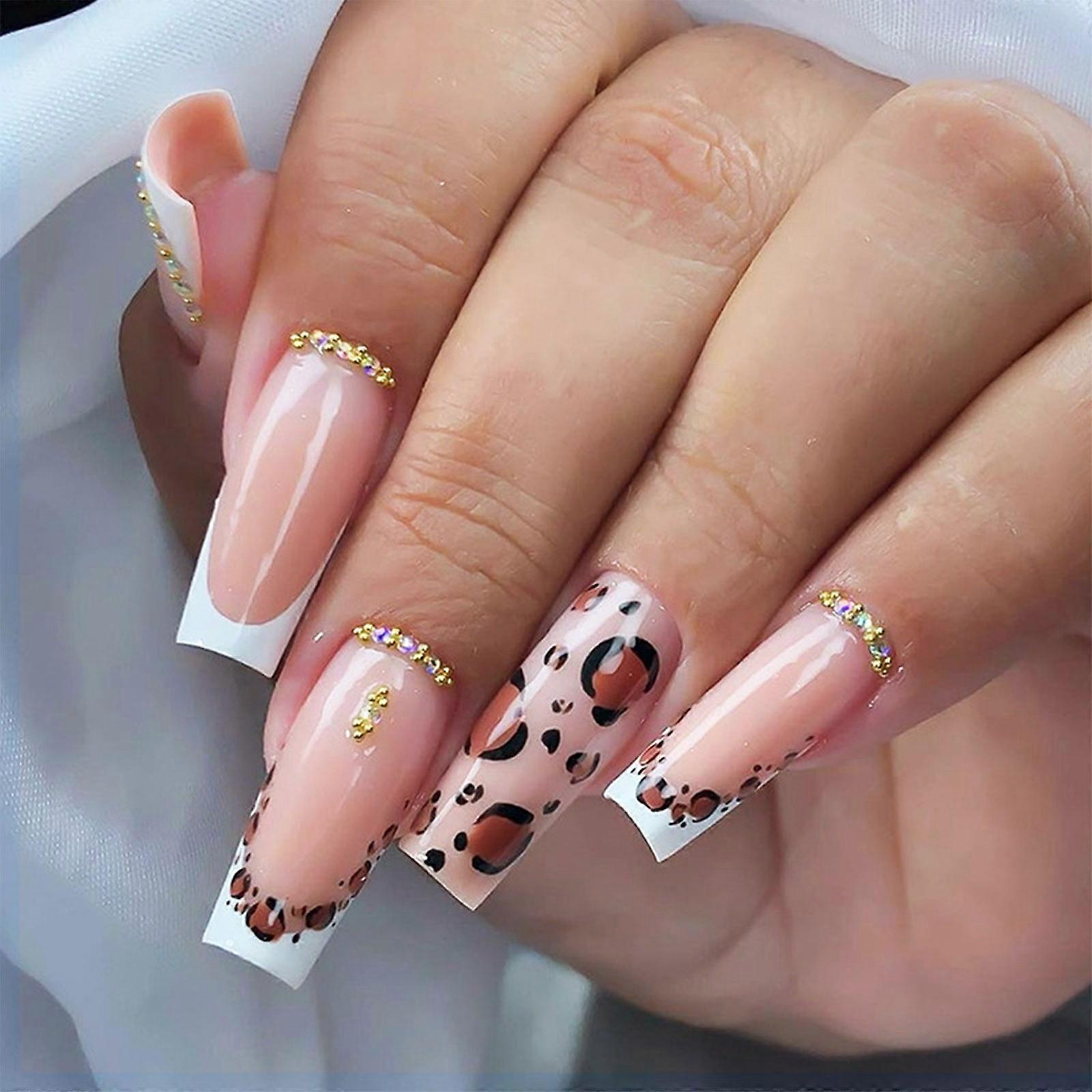 24Pcs Long Square Leopard False Nail Glossy Stick on Nail With White French Tip Full Covers Nail Art For Fashion Lover