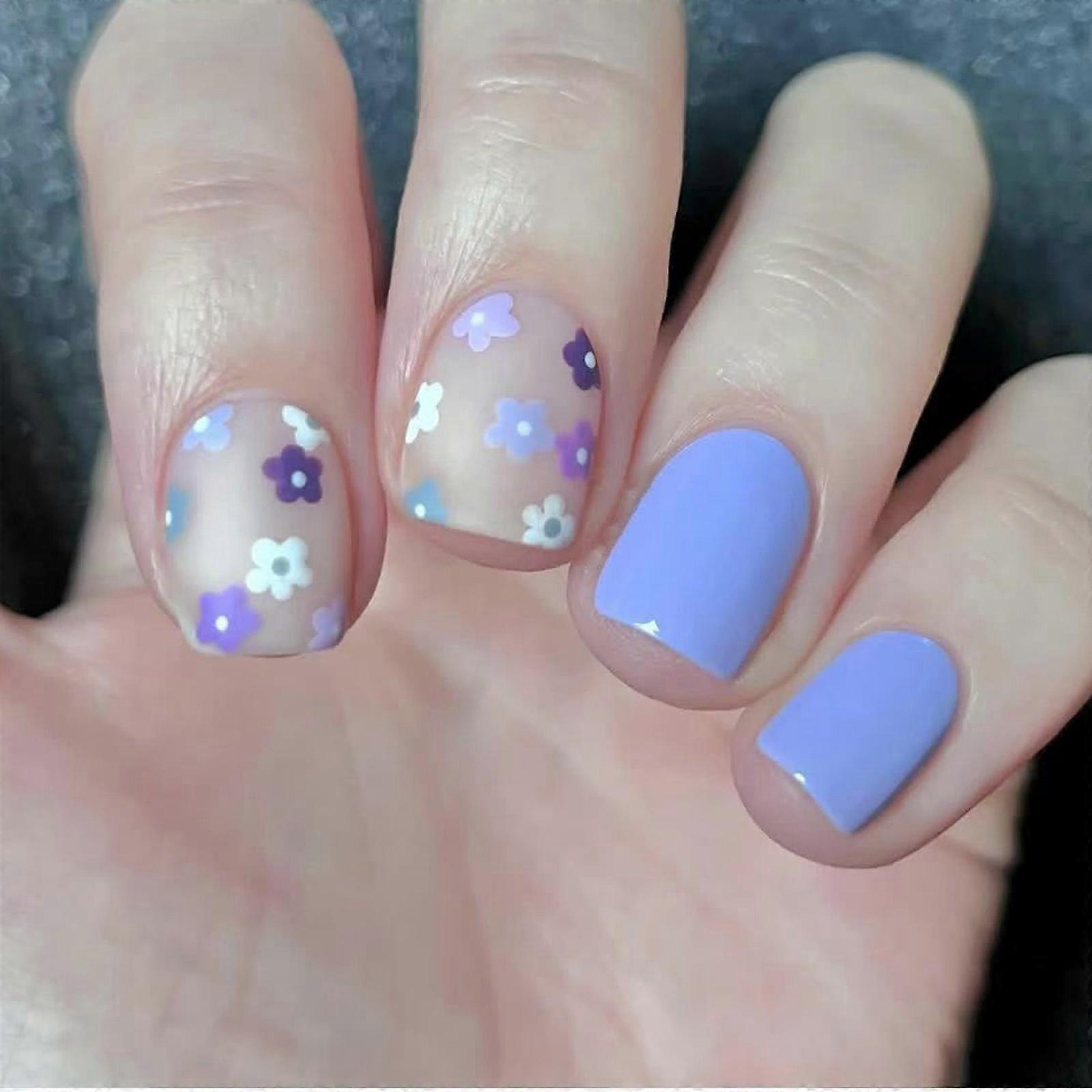 24 Pcs Purple Artificial Nail Short Square Full Cover False Nail Glossy Stick on Nail Flowers Press On Nail