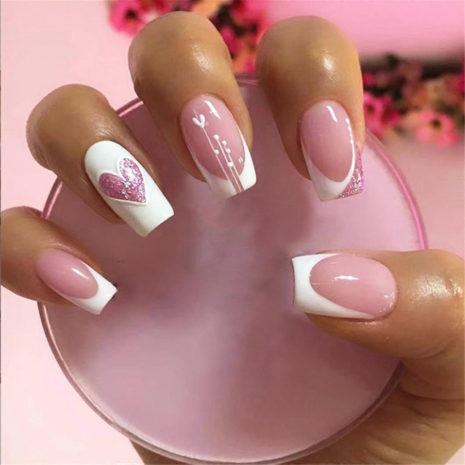 24 Pcs Medium Length Stick On Nail Glittering Heart Full Cover False Nail French Tip Press On Nail Manicures Supplies