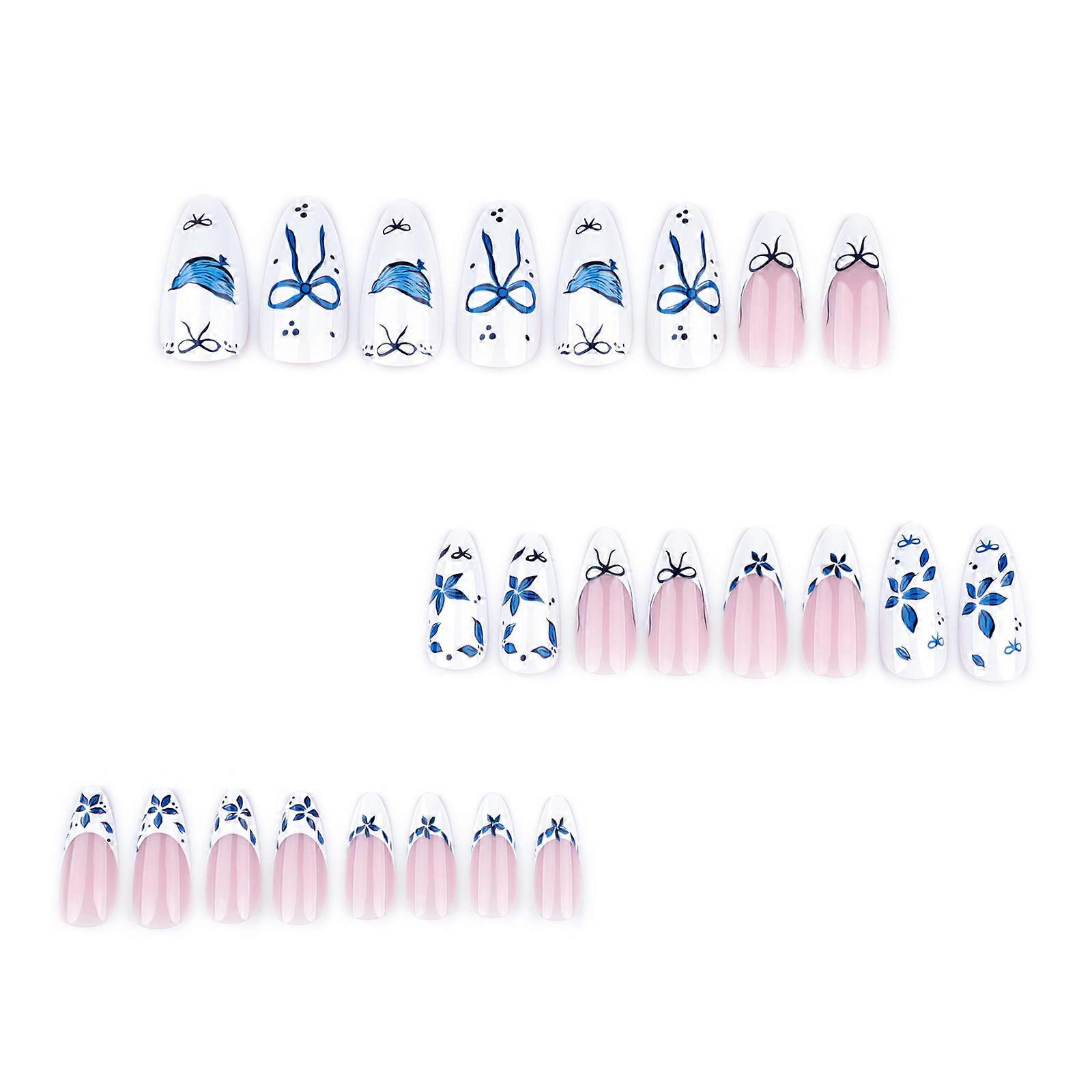24 Pcs Glossy Press On Nail French Tips False Nail Blue Flowers Full Cover Stick On Nail Short Almond Acrylic Nail