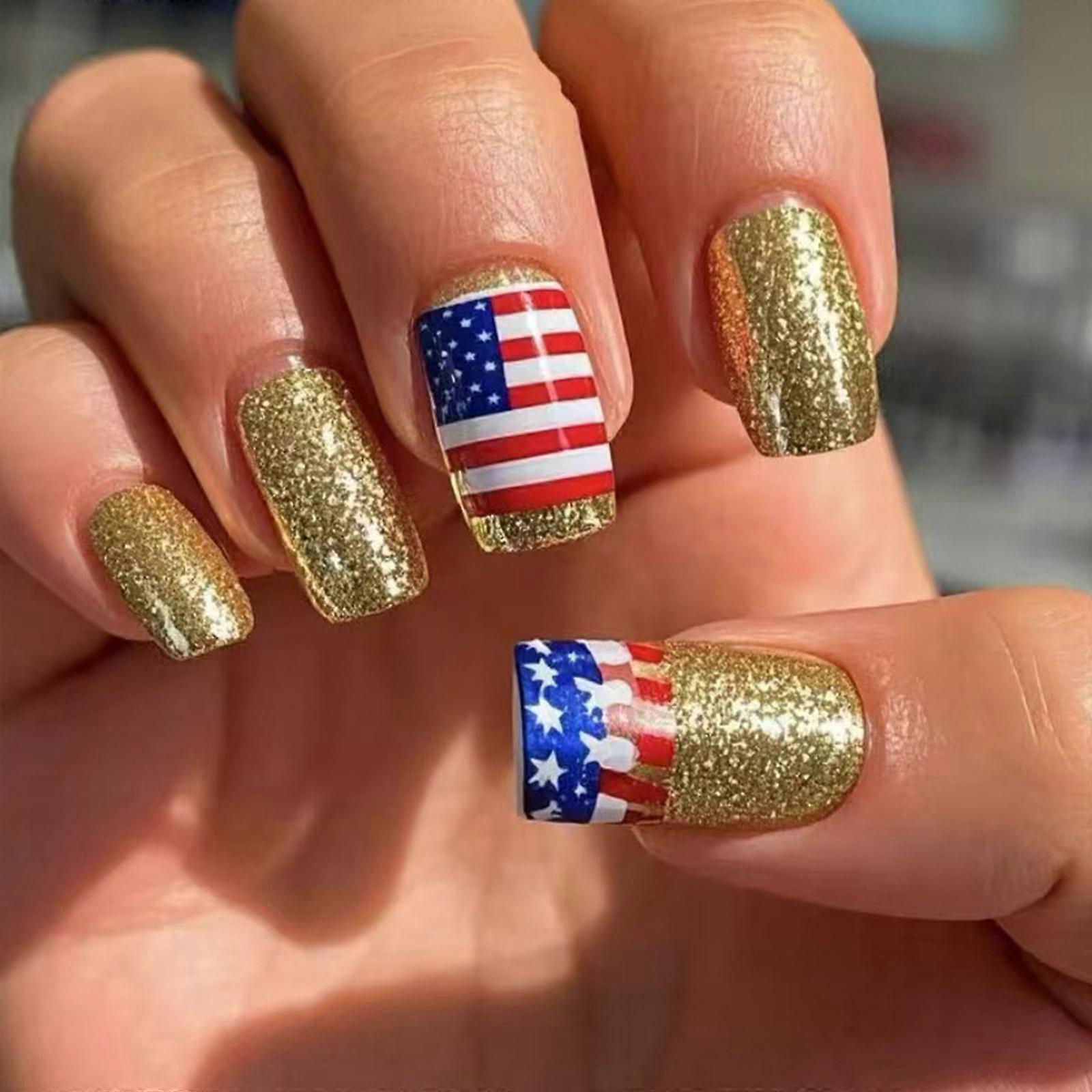 24 Pcs 4th of July False Nail Stripe Press On Nail Independence Day Stick on Nail French Tip Acrylic Nail for Woman