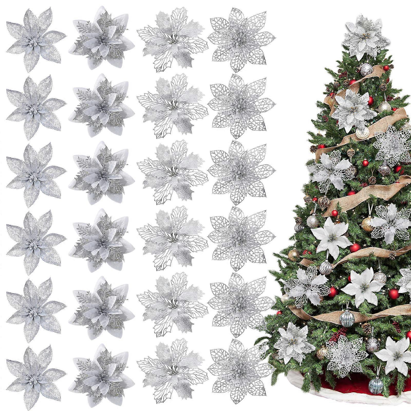 24Pcs DIY Silver Poinsettia & Clips, Christmas Floral Set