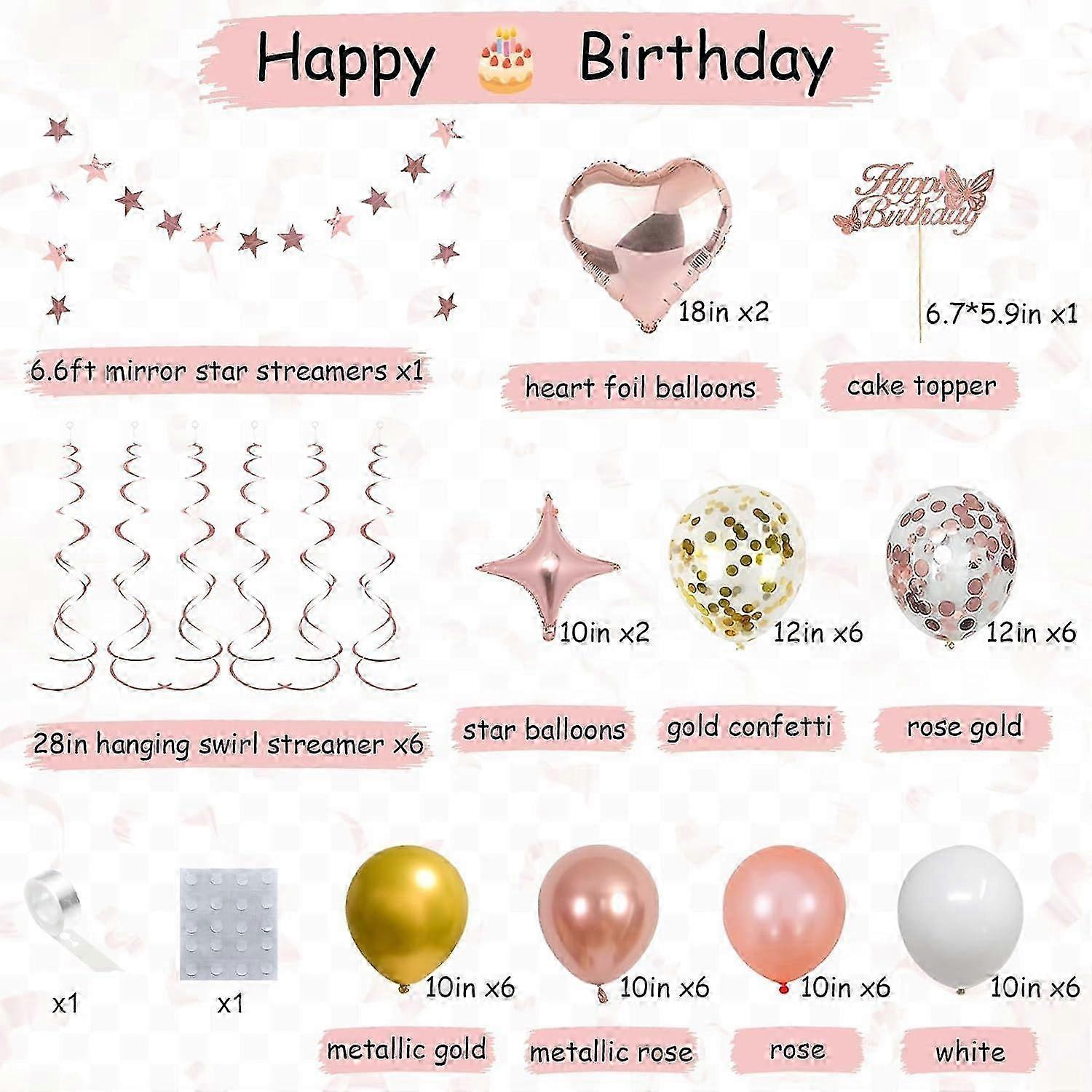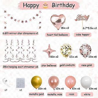 1.Rose Gold Birthday Decorations Set: Includes 3979in rose gold metallic tinsel fringe curtains2, 32in number foil balloons2, paper 'happy birthday' banner 1, 12in confetti balloons (rose gold6, gold6), 10in balloons (metallic rose gold6, metallic gold6, rose gold6, white6), 18in rose gold heart foil balloons2, 10in star foil balloons2, mirror star streamers garland1, hanging swirls1, cake topper1, 2pcs balloon tools. 2.: The latex balloons are made of high-quality natural latex, which is , non-toxic, besides, thicker material ensures that balloons are elastic and not easy to explode, and all balloons have been rigorously selected manually, fringe curtains and cake topper are made of premium materials, please feel easy to use. Shiny rose gold birthday supplies will surely bring you s 3.Best Choice for Women' 24th Birthday Party: There are beautiful rose gold balloons for making a balloon arch. Shiny rose gold fringe curtains, happy birthday banner, and stary mirror streamers are perfect supplies for making a decoration wall, more than 15 different rose gold decorative elements will make your birthday party unique. 4.Easy Assembly: Everything in the package is easy to assemble, balloons can be easily made into balloon arches using attached tools. Note: Due to the light and screen setting difference, the item's color may be slightly different from the pictures. Please allow slight dimension difference due to different manual measurement.