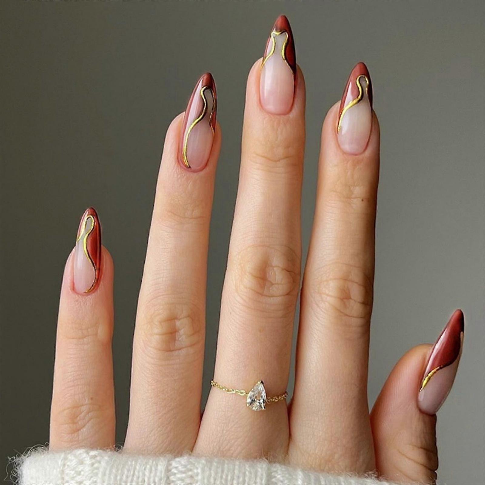 24pcs Almond False Nail Glossy Stick On Nail With French Tip Designs Acrylic Press On Nail for Women and Girls