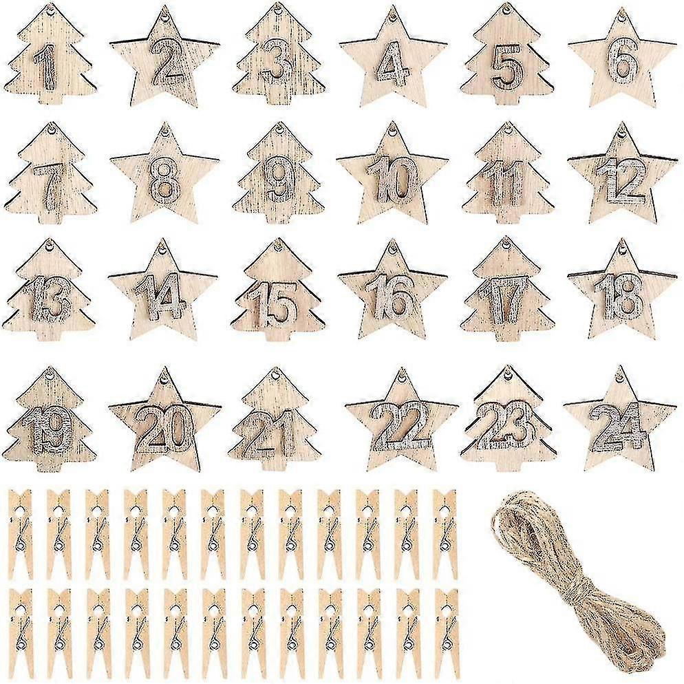 24pcs Christmas Advent Calendar, Wooden Number Tags, Christmas Tree Ornaments, Pendants With Clips