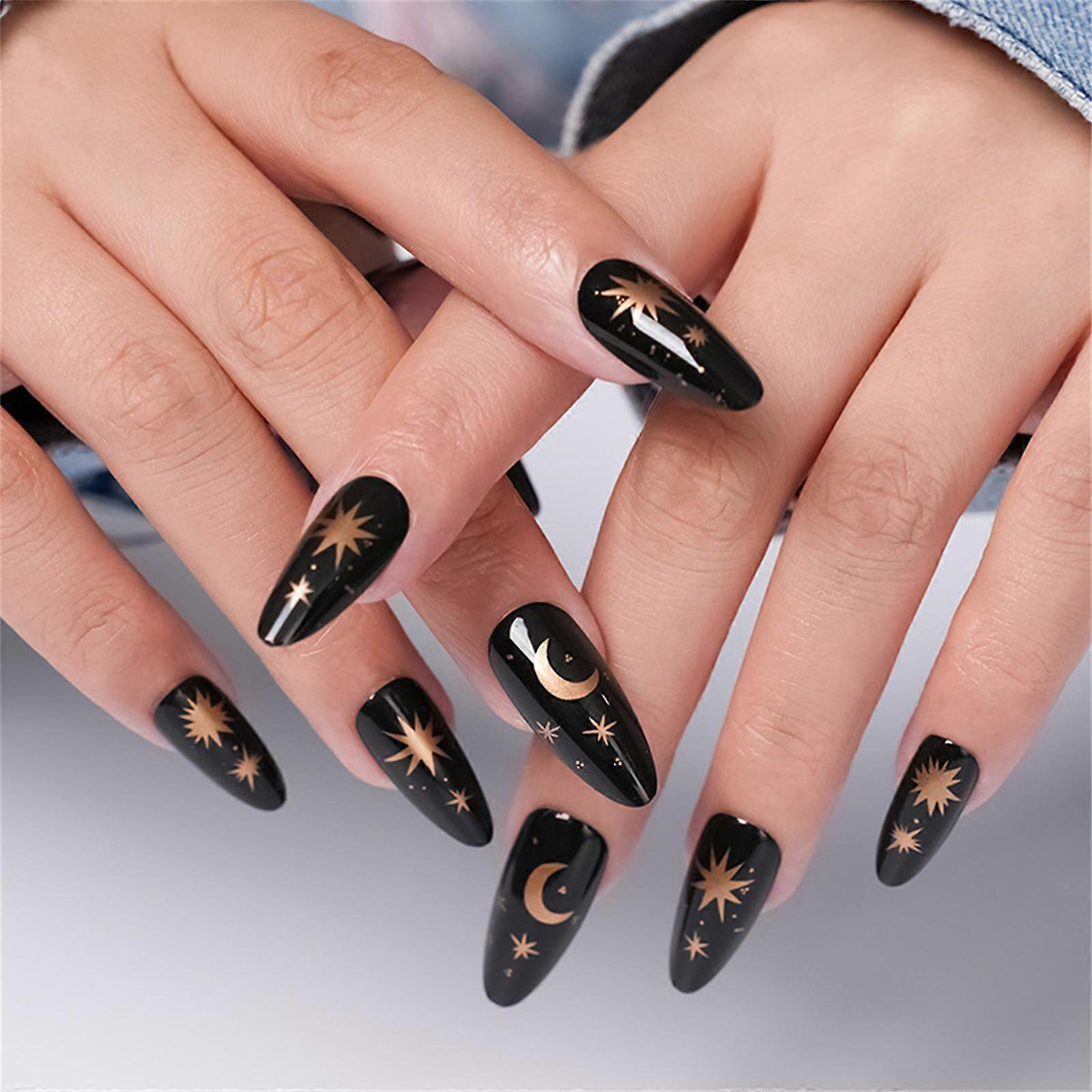 24pcs Gothic Black Medium Press On Nail French Tip Almond Shape False Nail with Star Moon Design Glues On Nail for Women