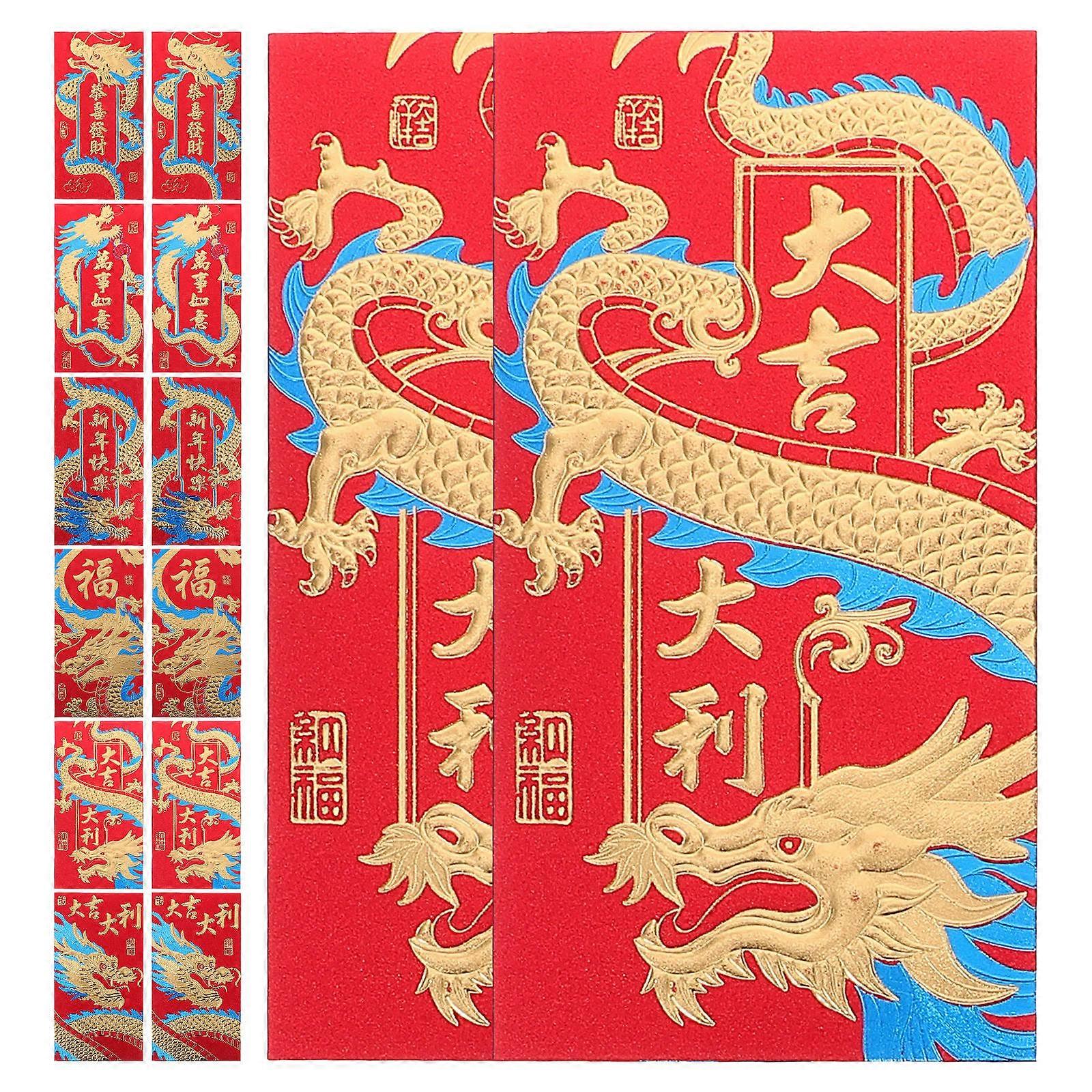 24PCS Dragon Year Red Envelopes with Cartoon Dragon Design, Frosted Blue & Gold Finish for Spring Festival Gifts & Invitations