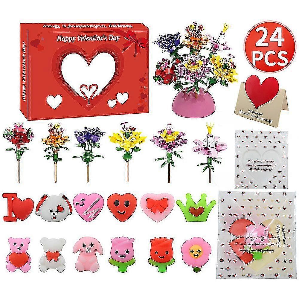 24pcs Valentine's Day Cards Diy Mini Squishy Toys Flower Building Block Toy For Kids School Classroom Gift Exchange Prize Party Favors