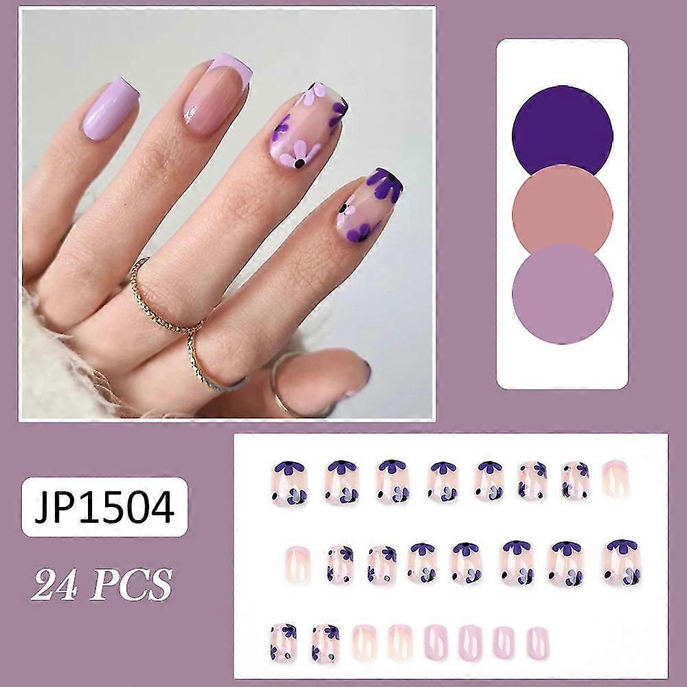 24pcs Purple False Nails Glossy Flower French Fake Nails