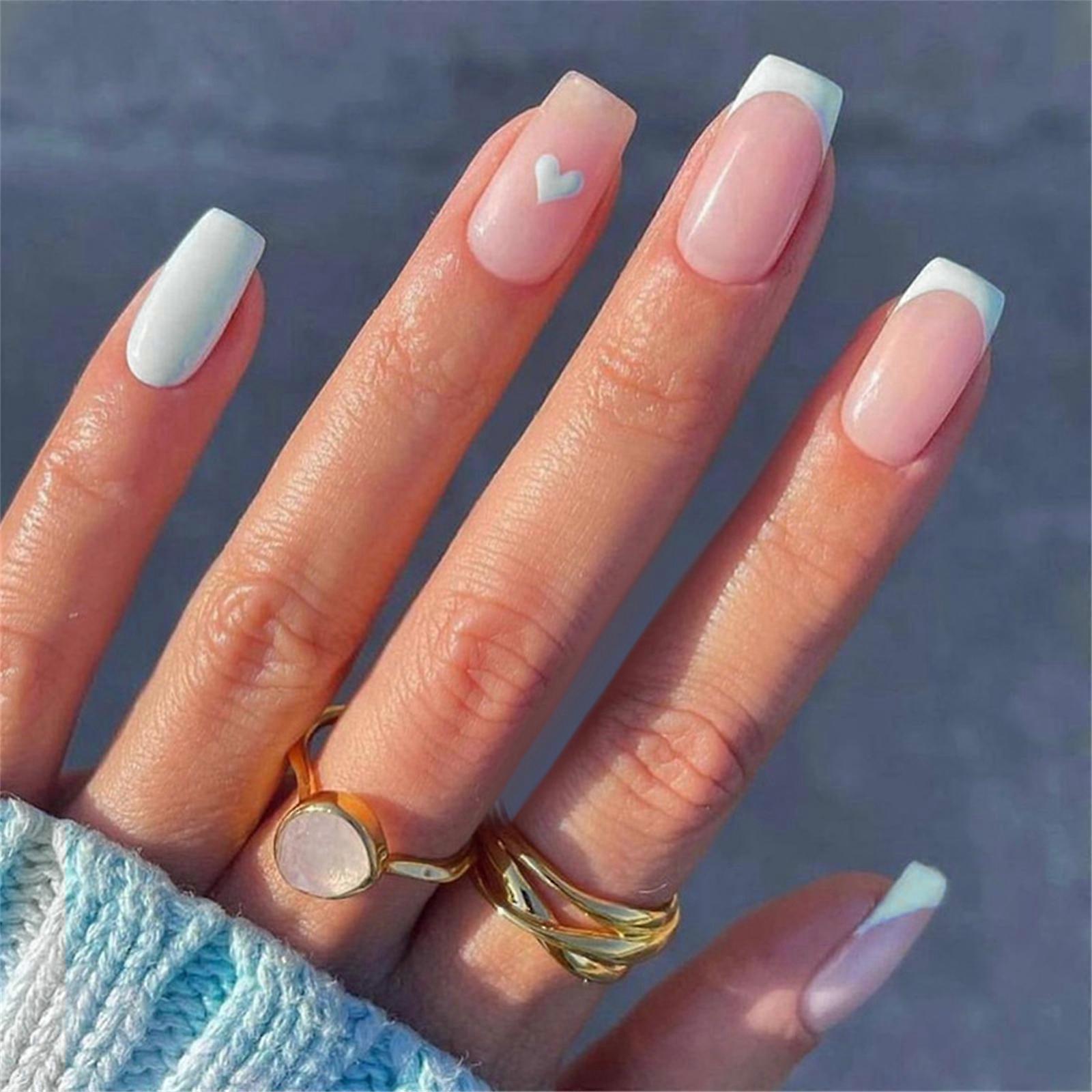 24pcs French Tip Press On Nail Medium Square False Nail with Heart Designs Cats Eye Artificial Stick On Nail for Women