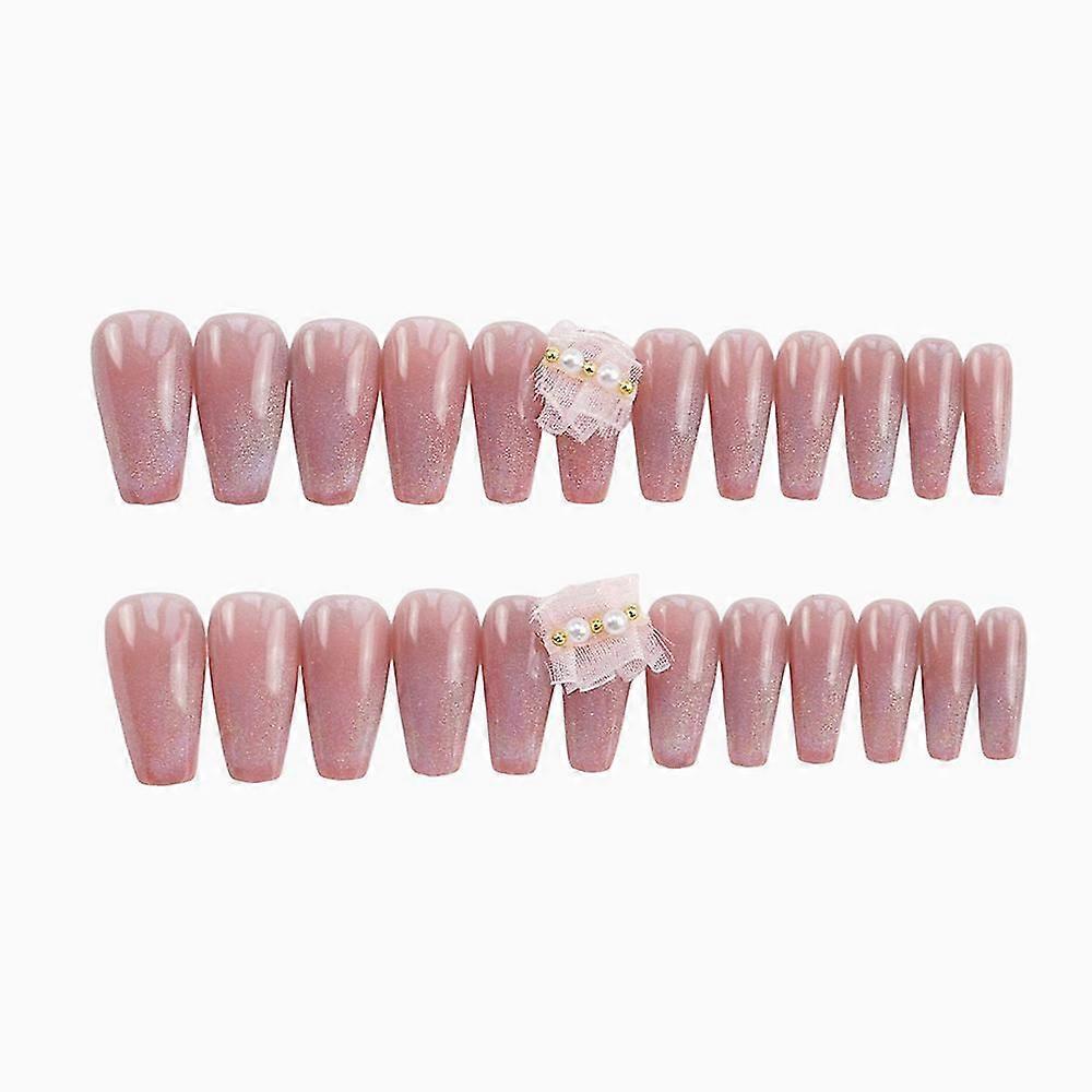 24pcs Round Glossy Press On Nail Pearl Decor Pink Removable Nail Manicure Set